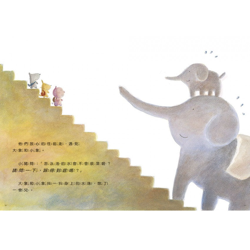 小狗、小貓和小豬問:「游泳池的水會不會很深啊?踩得到底嗎?」