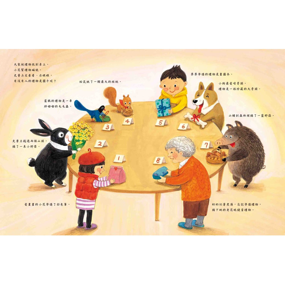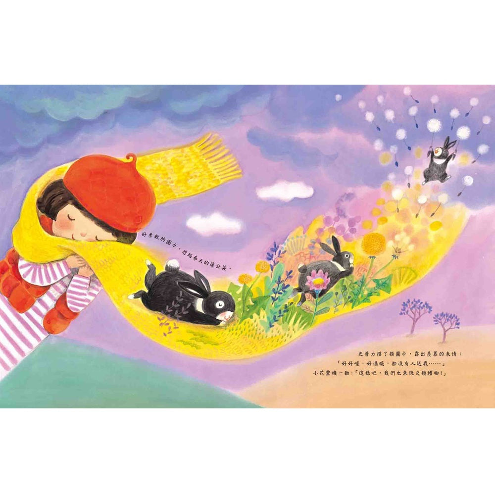冬天到了,整個山林變得很不一樣,偶爾有陽光露臉,偶爾灰灰的天空讓人更加期待與好朋友相聚。小花圍了一條很漂亮的圍巾,史普力也很想要有一條,於是他們貼出了海報,邀請山林裡的朋友一起到老奶奶家玩交換禮物。