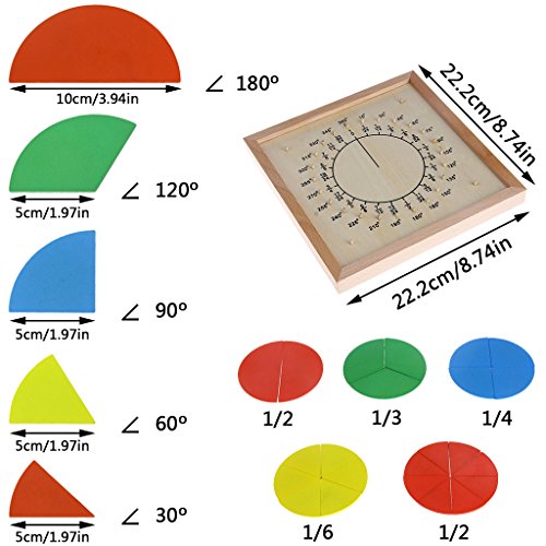 產品由5組圓形組成,分別為2、3、4、5、6份,並包含一個印刷角度和小木板的分數。由23個雙面圓形分數組成,幫助孩子理解分數與整體的關係,提升數學概念。