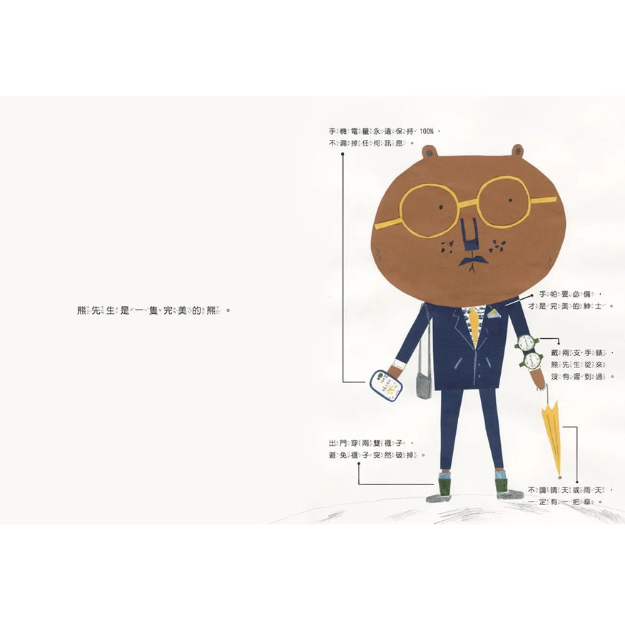 熊先生是一隻完美的熊。手機電量永遠100%、出門要穿兩雙襪子並且配戴兩支手錶、不論晴天雨天都會帶著雨傘。