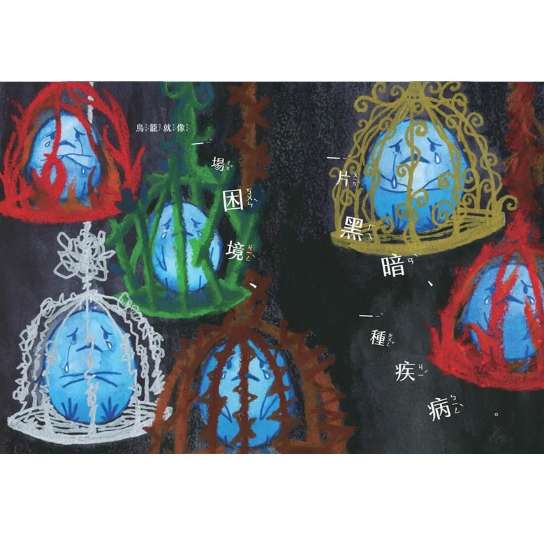 憂憂看起來好不開心,許多的煩惱、心事像鳥籠一樣將他困住了。