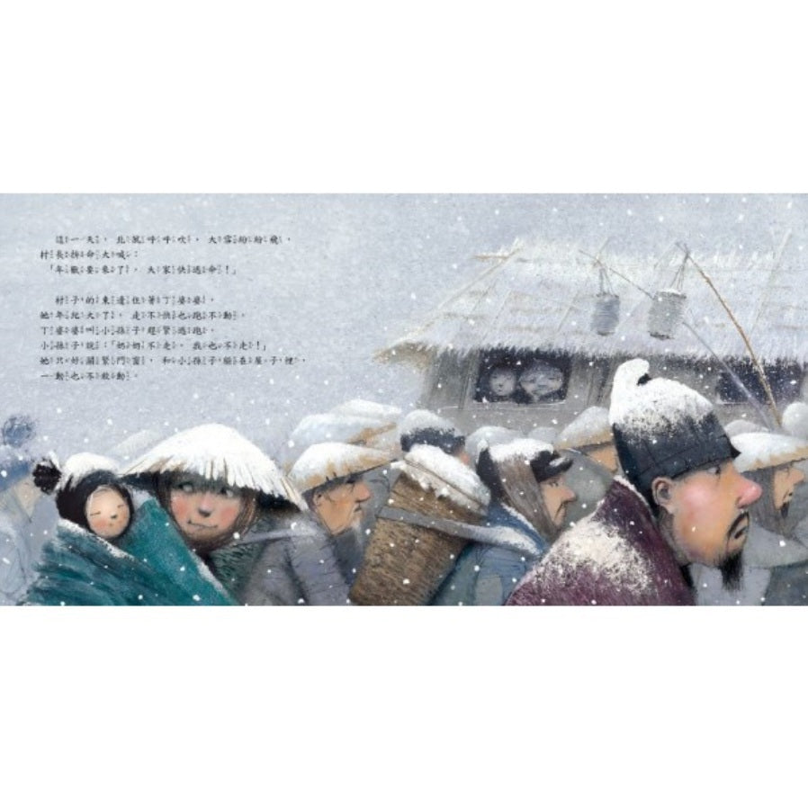 從前從前,有一隻可怕猛獸叫做「年」,牠會從海底爬上岸,到處找東西吃。只要被牠看見,就會被吃下肚。這一天,北風呼呼吹,天氣冷得不得了。村長一邊大喊:「年獸要來了!」一邊趕著村民上山。住在村子東邊的丁婆婆和孫子來不及逃跑,只能躲在家裡,希望能平安度過危險。這時,一位老爺爺出現,他自告奮勇說要收拾年獸!究竟他會怎麼做呢?