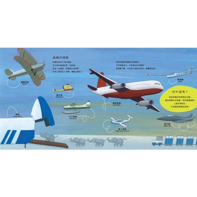 除了有飛行發展史、飛機構造圖,還有超大跨頁的機場全景,讓人彷彿身歷其境!書末也附有手作旅行紀錄本、紙飛機和配對遊戲。