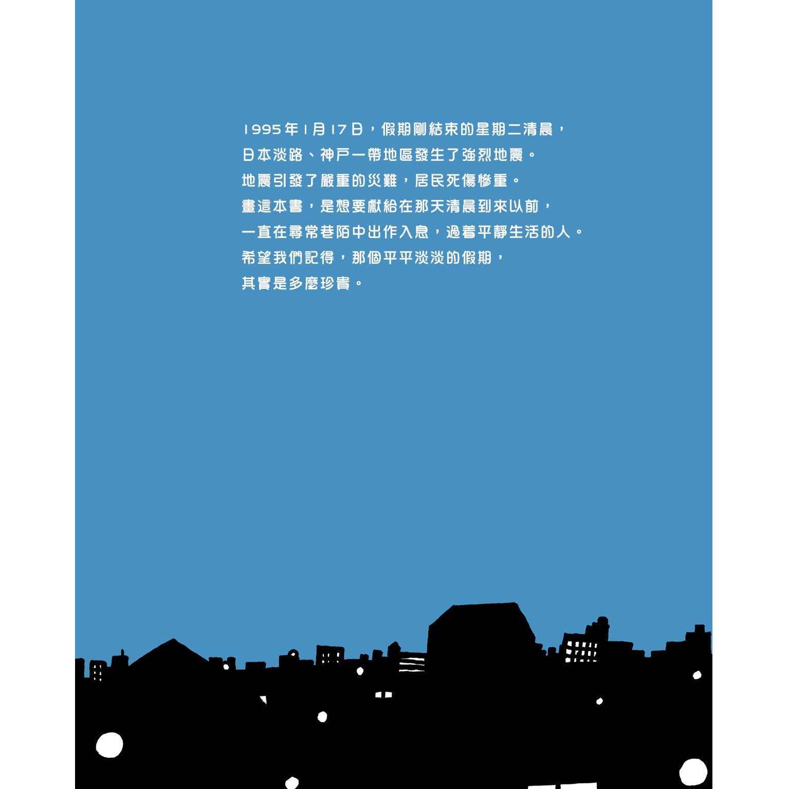 1995年1月17日清晨,日本發生阪神大地震,數萬人傷亡。作者寫道:「獻給在那天清晨到來以前,一直在尋常巷陌中出作入息,過着平靜生活的人。希望我們記得,那個平平淡淡的假期,其實是多麼珍貴。」筆下愈平淡,沒寫出來的無常便顯得愈深刻。說珍惜,何其有力。