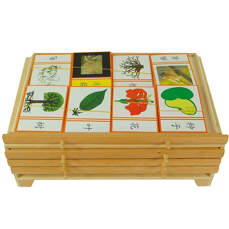 教具構成:一個收納筐,四層抽屜,兩層裡每層裝有6個葉形嵌板。一層裝2個葉形狀嵌板。一層空餘可裝動植物三部卡。