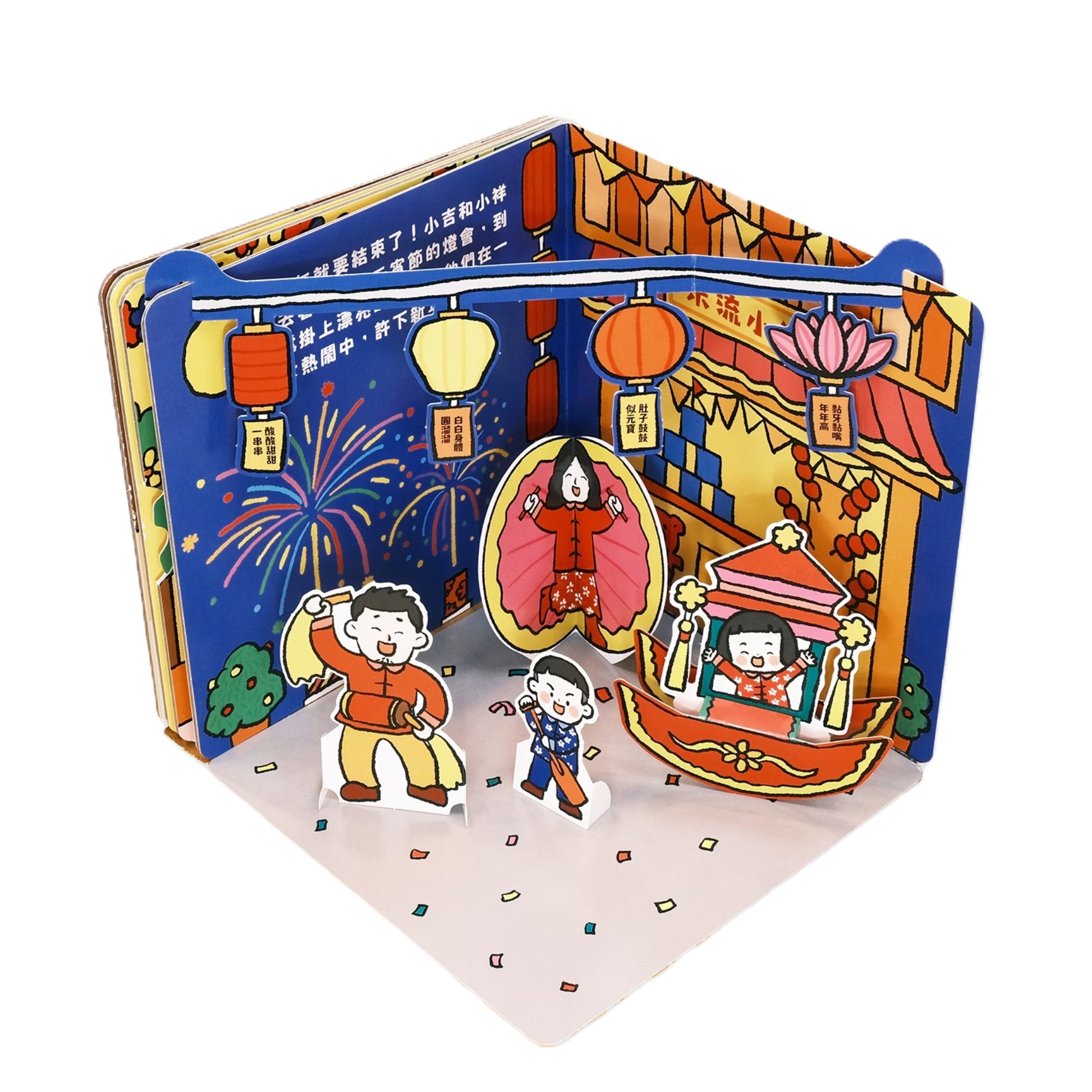 孩子可以自己動手打造出3D立體場景,有在家門口大掃除、除夕夜一家子圍爐、親戚家拜年、元宵節猜燈謎的場景,完整呈現過年的習俗活動!