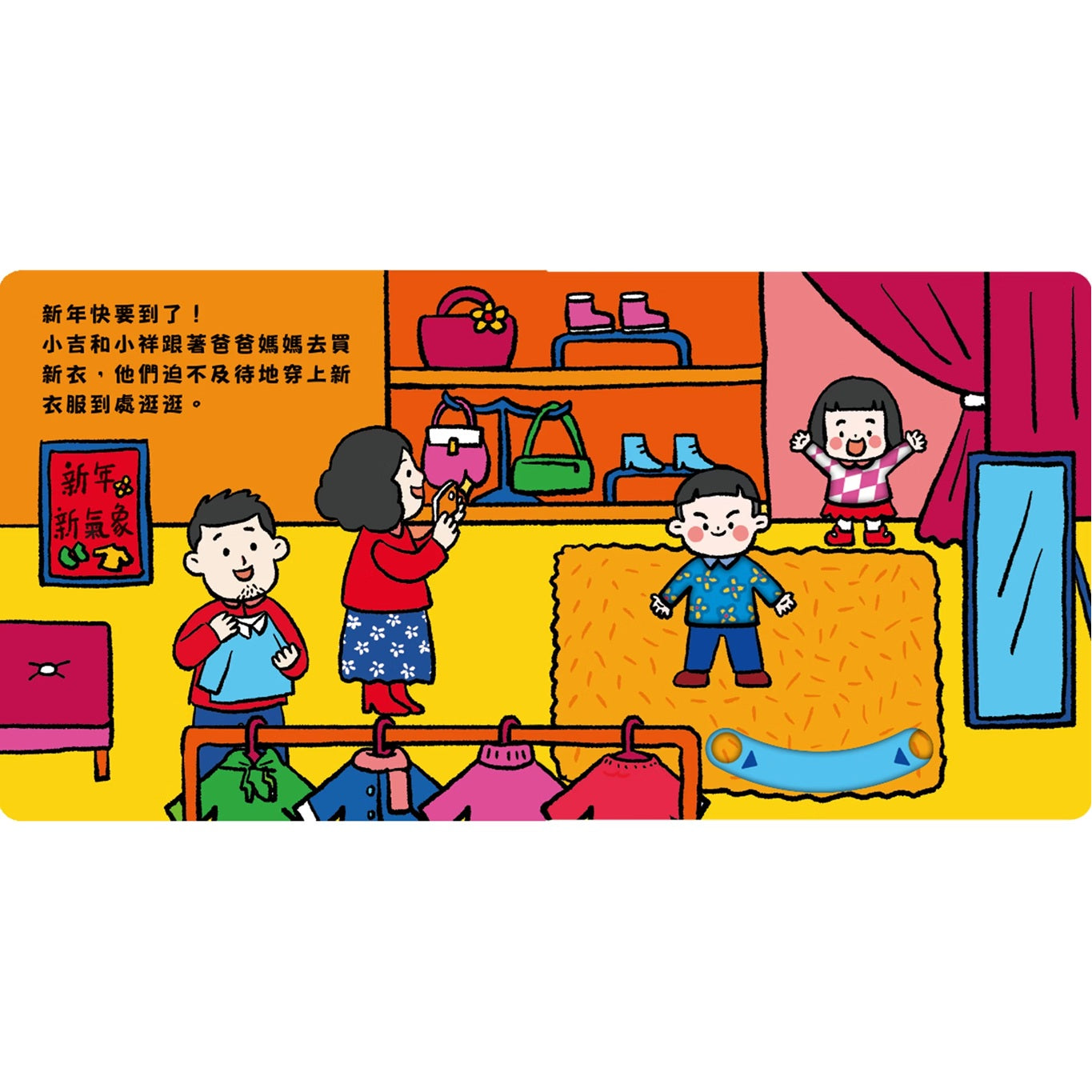 快要過年了,小吉和小祥為了迎新年,開始買新衣、備年貨、貼春聯、大掃除,他們都好期待新年的到來!推一推、拉一拉、轉一轉,跟著小吉、小祥,體驗華人傳統習俗,感受滿滿的年味吧!