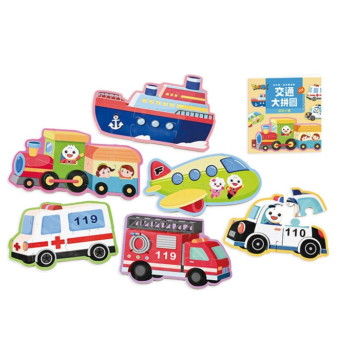 本產品附六款大拼圖及一本認知小書,拼圖為厚紙卡設計,大塊易抓握,