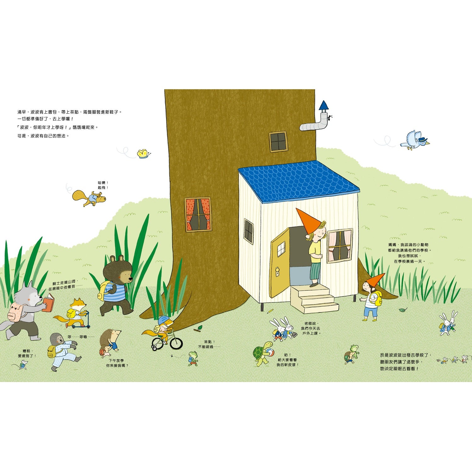 波波背上書包,拿好茶點,