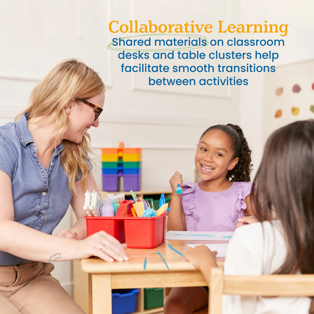 Cultivate a collaborative environment with ECR4Kids 3-Compartment Small Caddies. These sturdy supply organizers are perfect for teachers and educators to use in the classroom or library. Plastic bins provide a storage solution with endless possibilities for office supplies, writing utensils in a home, or toiletries in a college dorm. Each of the three compartments is designed to keep small items organized on and off the floor. In the classroom, caddies help while facilitating lessons and encourage team-oriented activities. The versatile storage containers are easily transported to workstations to conduct art lessons, science experiments, or STEAM activities. Use compartments to sort objects by color, size, shape, or any other characteristic. Create themed kits for subjects such as a weather kit with thermometers and charts. Store art supplies for paints, brushes, clay, and other materials. Little learners will learn the importance of organization by returning pens, scissors, glue, and crayons to the intended compartment during cleanup. Keep track of school supplies and personal belongings by having a specific place with structured compartments. Supply organizers feature rounded edges, an easy-to-grasp scoop center handle, and a curved interior to simply remove contents. Caddies conveniently nest to save valuable classroom space.