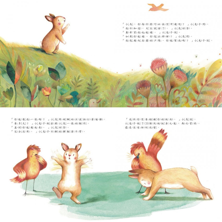 儘管小鳥覺得小兔子的想法很瘋狂,但他並沒有拒絕小兔子,反而尊重他的想法並且鼓勵和提供幫助,就像人生的道路上,父母對孩子無怨的鼓勵與支持。
