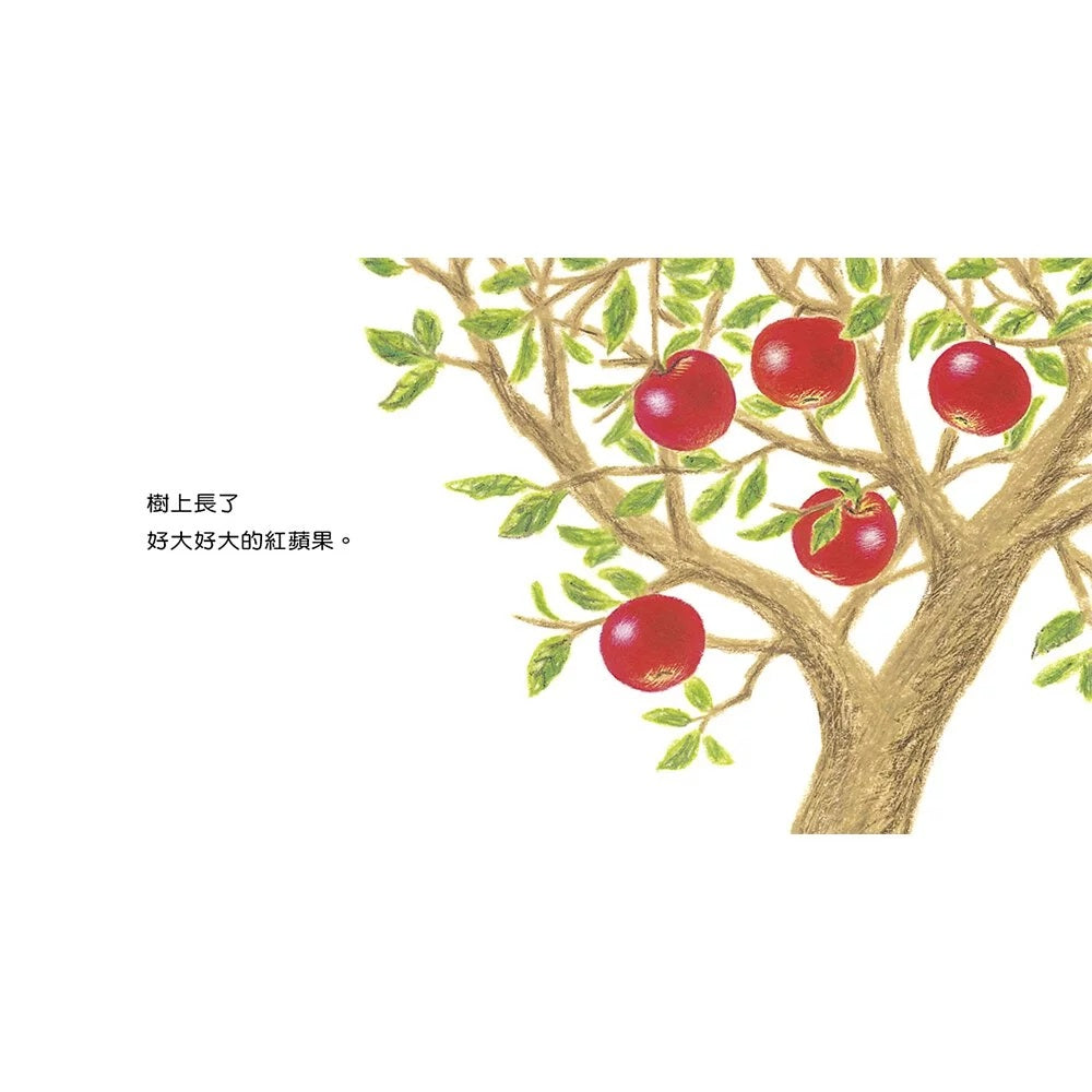 樹上長了好大好大的紅蘋果,「我要吃囉!」小熊摘走了一個。「我要吃囉!」小松鼠抱走了一個……動物們一個接一個將蘋果拿走了,但枝頭上還有最後一個蘋果,還會有動物來帶走它嗎?
