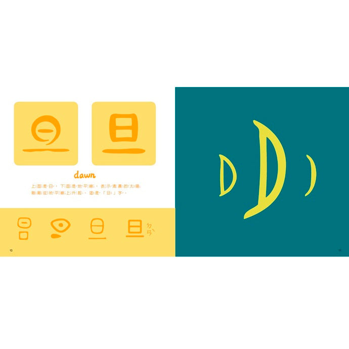 本書收錄近百個漢字,每個漢字對比古文、今文與英文,