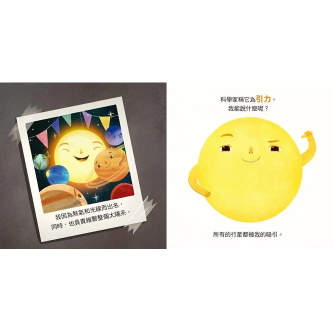 本書中介紹太陽的基本結構組成,透過圖文並茂的方式,讓小讀者能夠迅速學習到和太陽相關的知識,並且透過圖片深植小朋友的記憶中。
