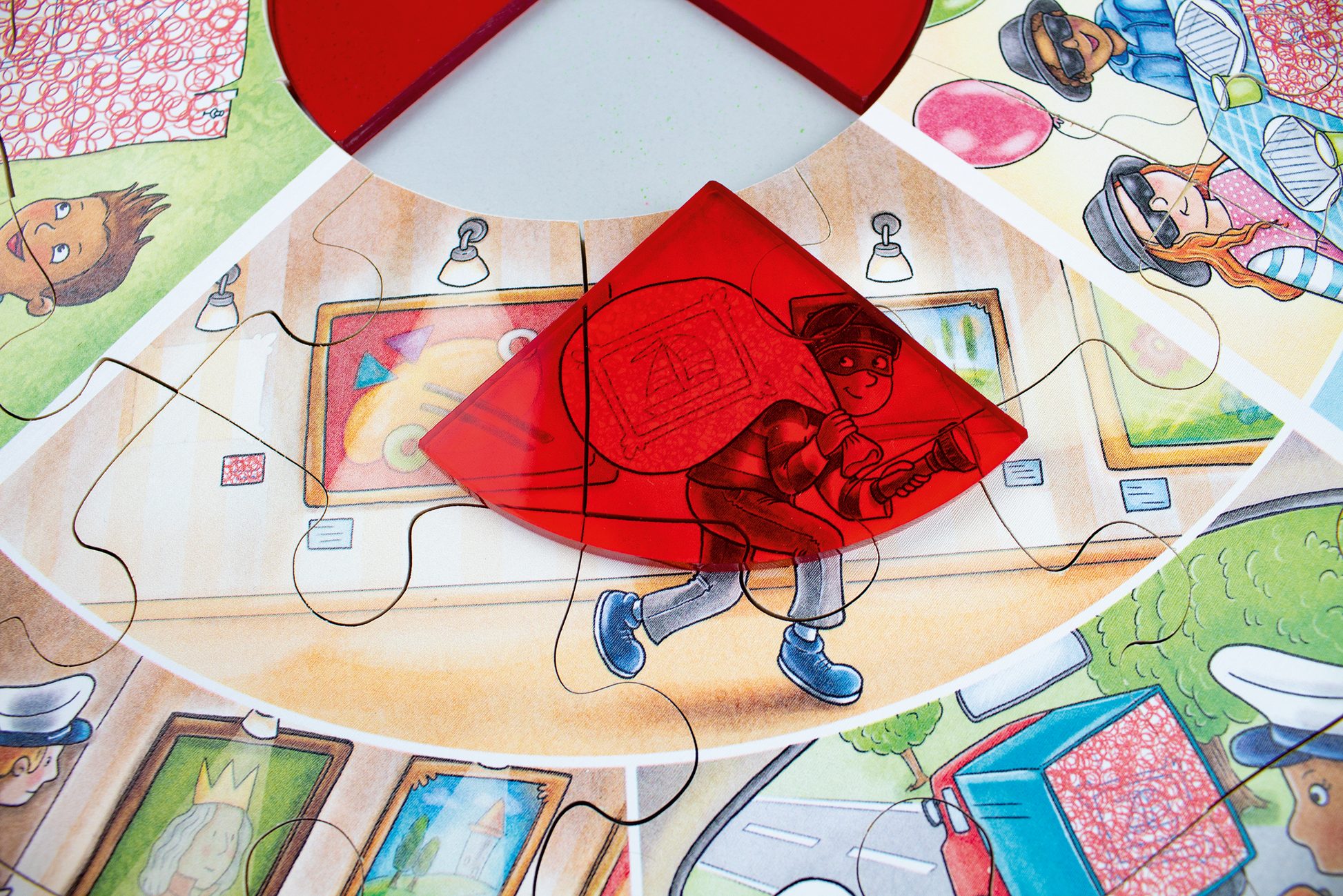 Who has ever been like a detective and gone out on a search? This puzzle makes it easy to find things out, to discover, to look closely and to search. The red plexiglass screen in the middle can be removed and placed on the areas that at first appear red and “opaque”. Take a close look and see what you can observe!! Also, the margin is full of symbols. Can you find all of them on the puzzle?