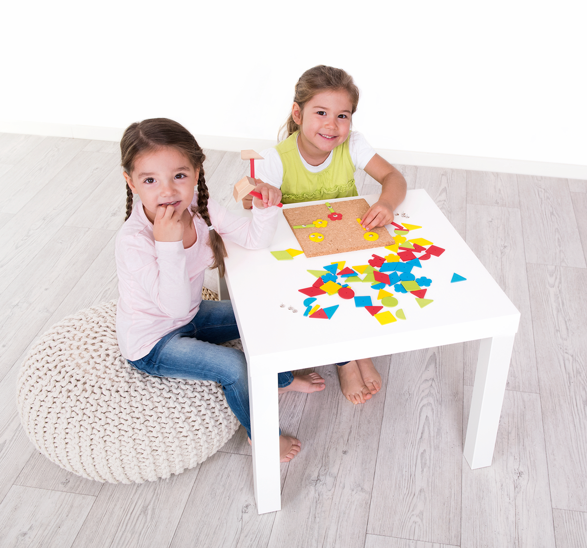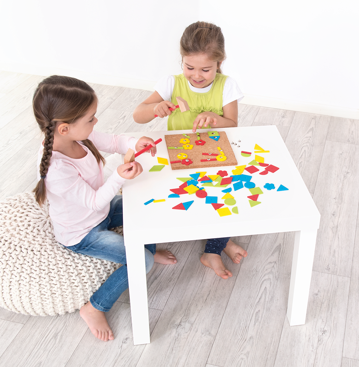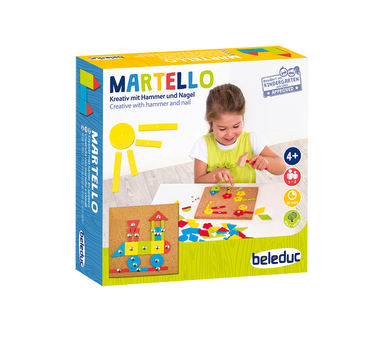 Use the wooden hammer and nails to affix the shapes to the cork plates. Removing all the pieces afterwards is just as easy. An instruction guide with coloured examples is included to help very young children try to make their first pictures.