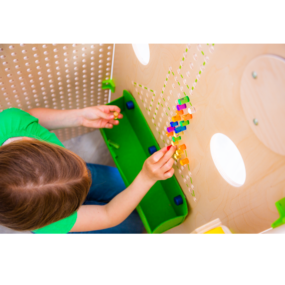 • 48 translucent pegs create endless designs on hole boards—from math patterns to abstract art