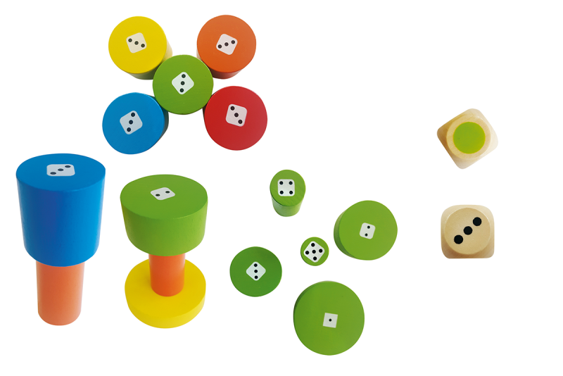 The children use either the dice with colours or the dice with dots. Depending on the colour or number of dots that come up when the dice is thrown, the children build towers and the winner is the one who stacks the bricks skilfully and produces the highest tower.