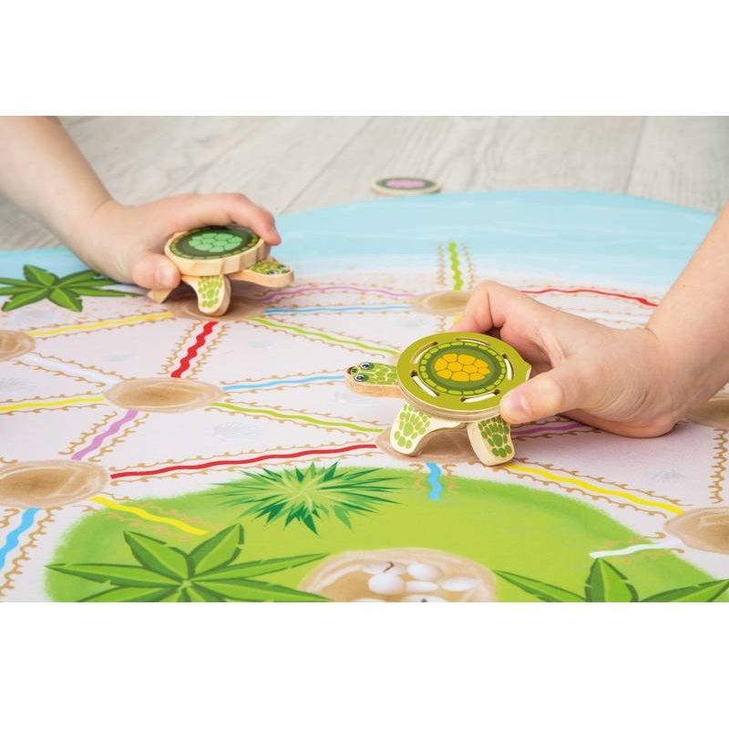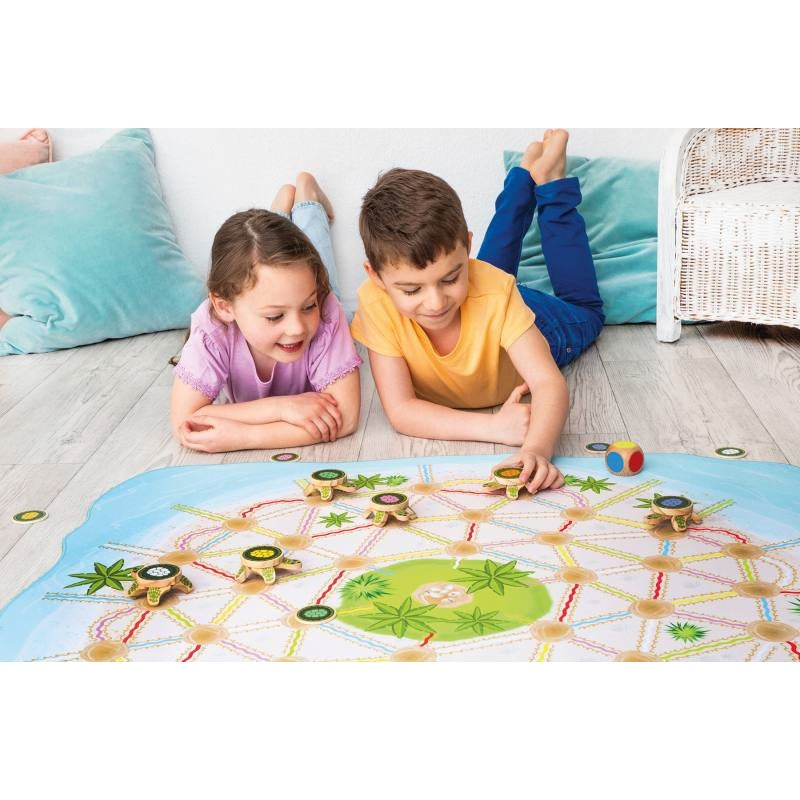 Gameplay: Children take turns rolling the dice and moving their turtles based on the results, exploring various challenges and surprises on the game mat.