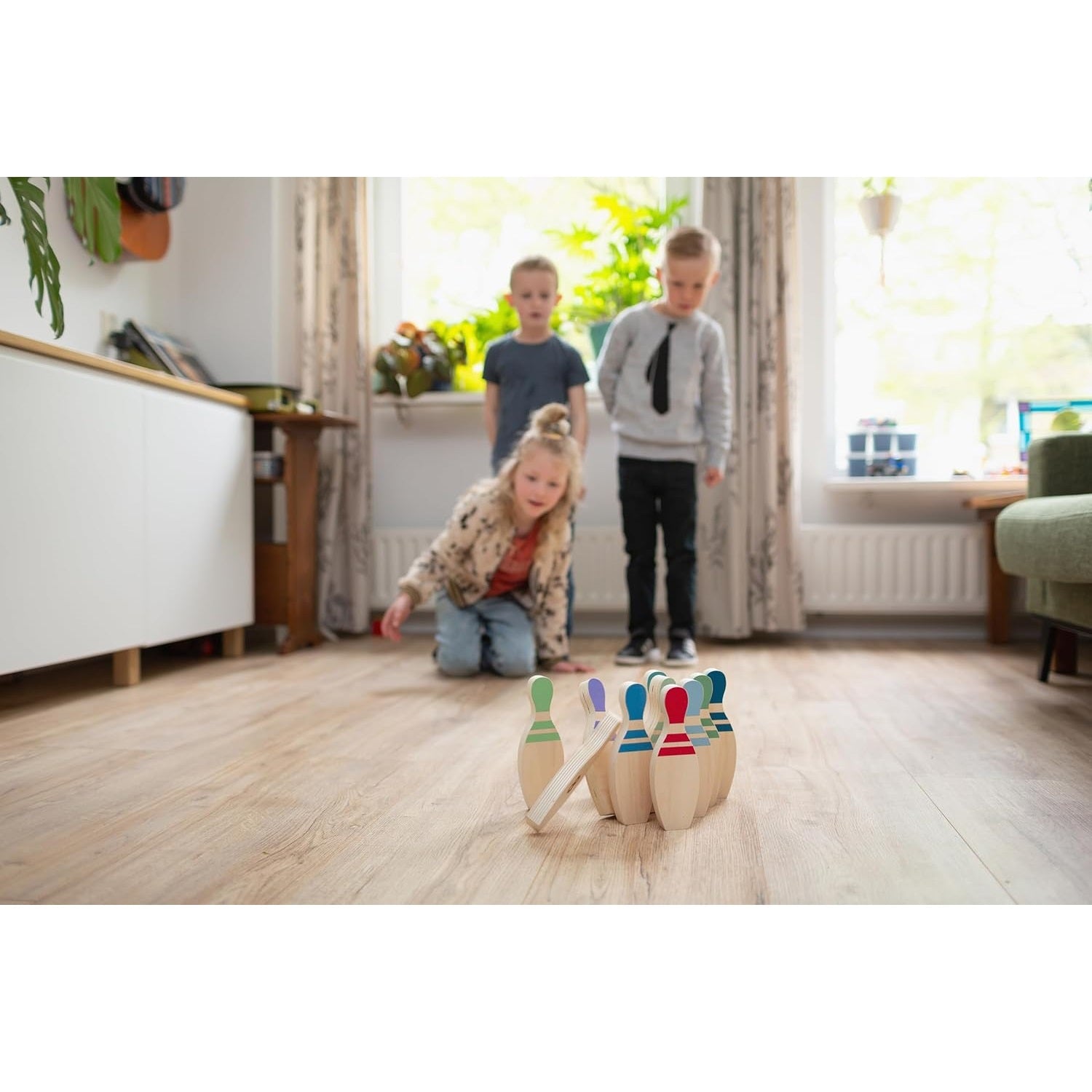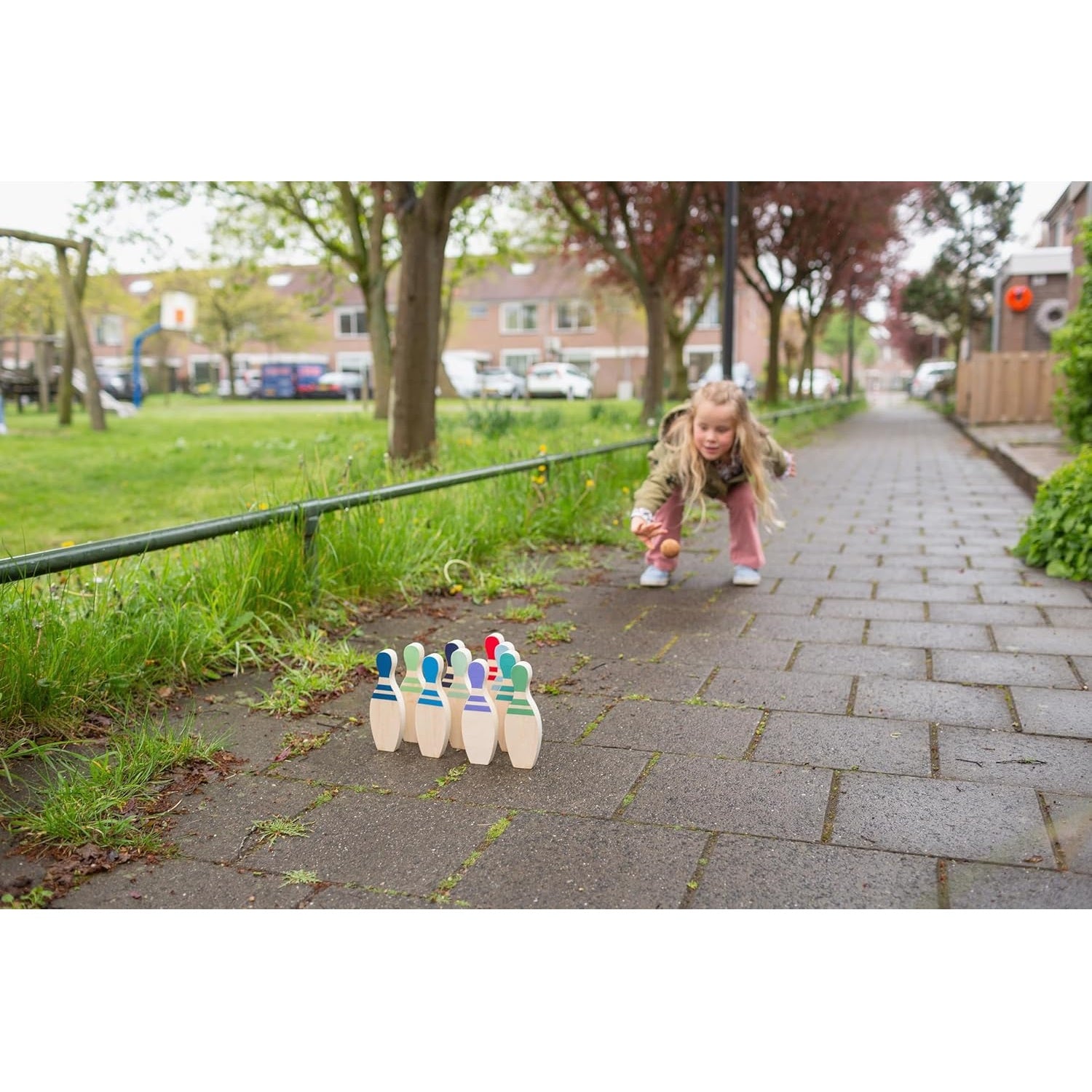 This adorable bowling set features numbered pins for kids to play and learn. The beautifully colored pins also make for a charming decoration in a child's room. Let children develop their coordination skills while enjoying the fun of outdoor play!