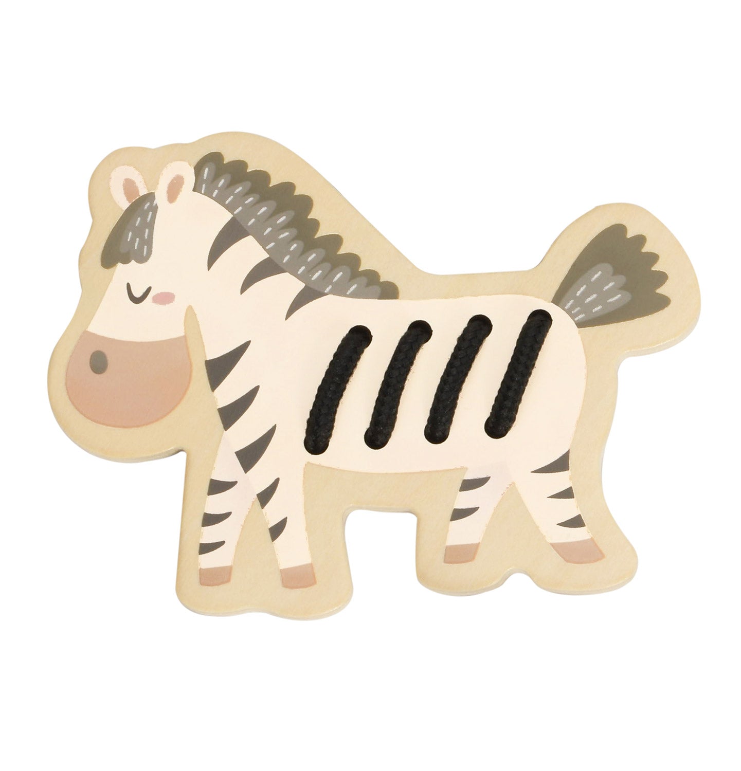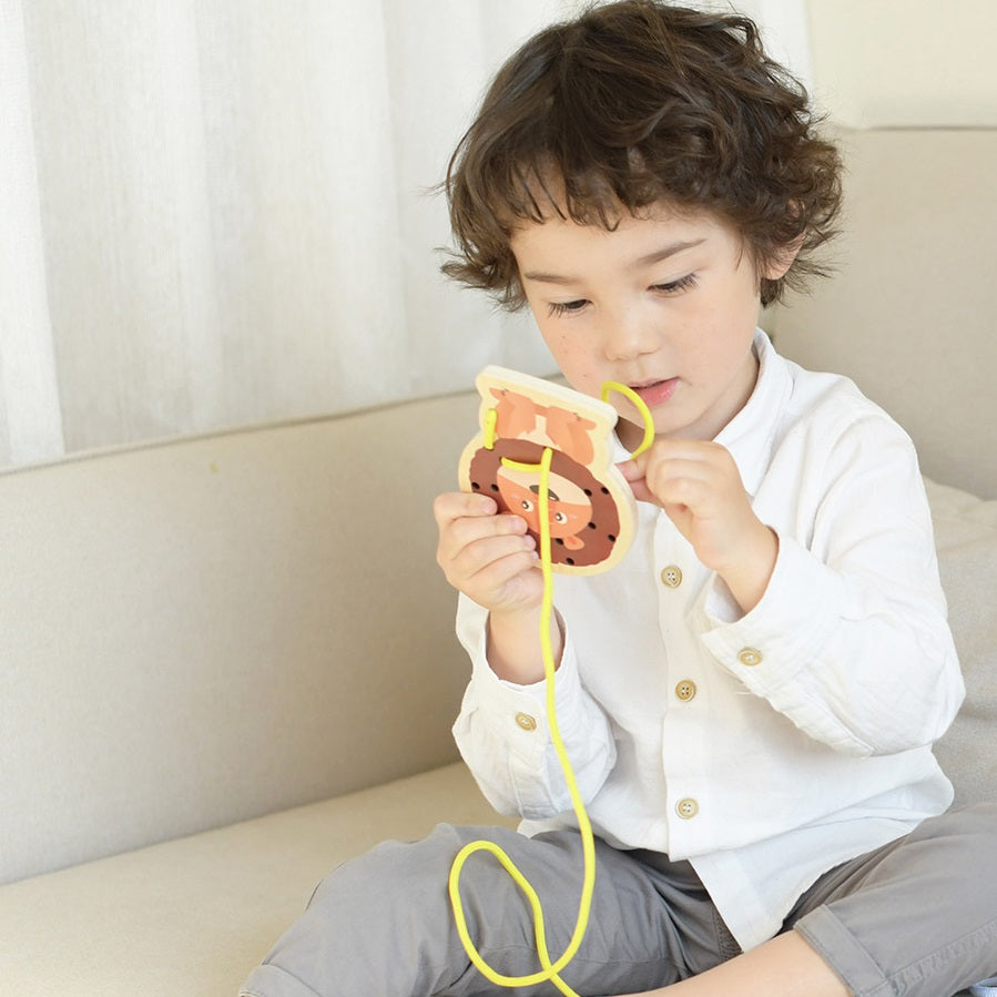 It is a creative African animal lacing toy. Children can use coloured ropes to pass through the small holes, creating different animal characters. It is great for developing to hand-eye coordination and fine finger movements.