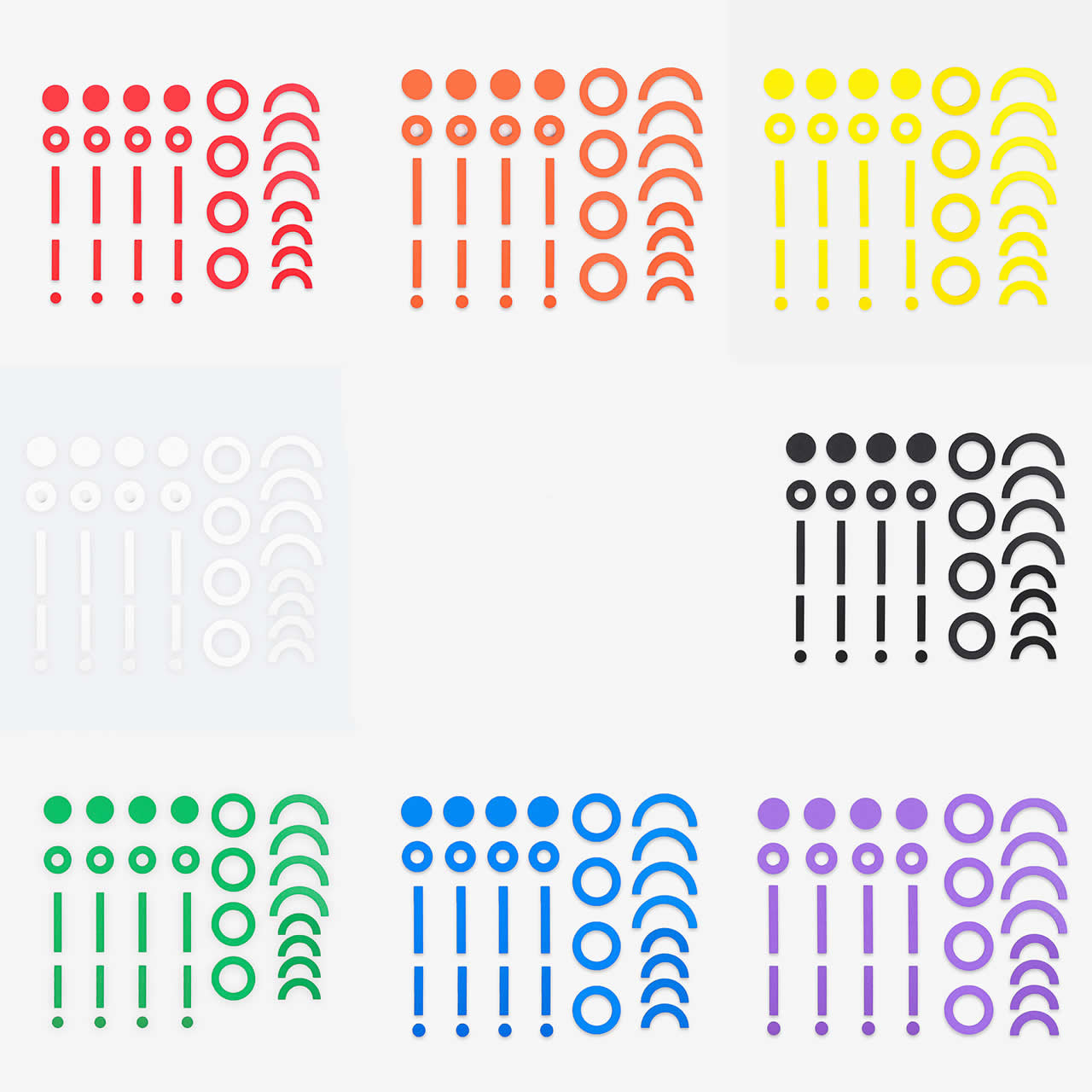 套裝共包含 256 個實木磁力片,具有 8 種不同形狀:短條、長條、大半圓環、小半圓環、大圓圈環、小圓圈環、大圓圈和小圓圈。每種形狀有 8 種顏色:紅色、橙色、黃色、綠色、藍色、紫色、黑色和白色,每種顏色有 4 個。