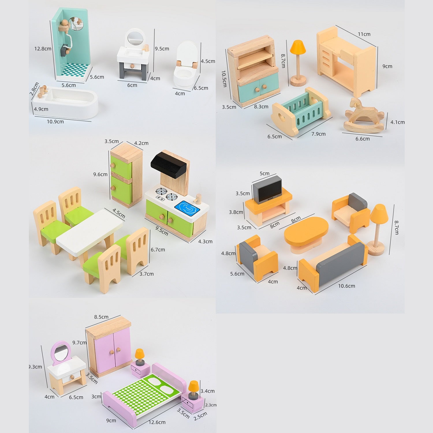 Includes furniture sets for the bedroom, kids’ bedroom, living room, kitchen, dining room, and bathroom, creating a complete dollhouse scene.