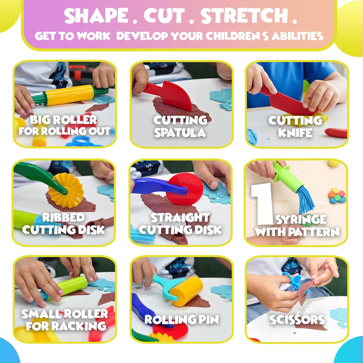 擠壓器和模具(動物、植物等)允許孩子們學習形狀。泥膠工具(滾筒、切割器等)讓幼兒在遊玩中練習手眼協調能力和耐心。