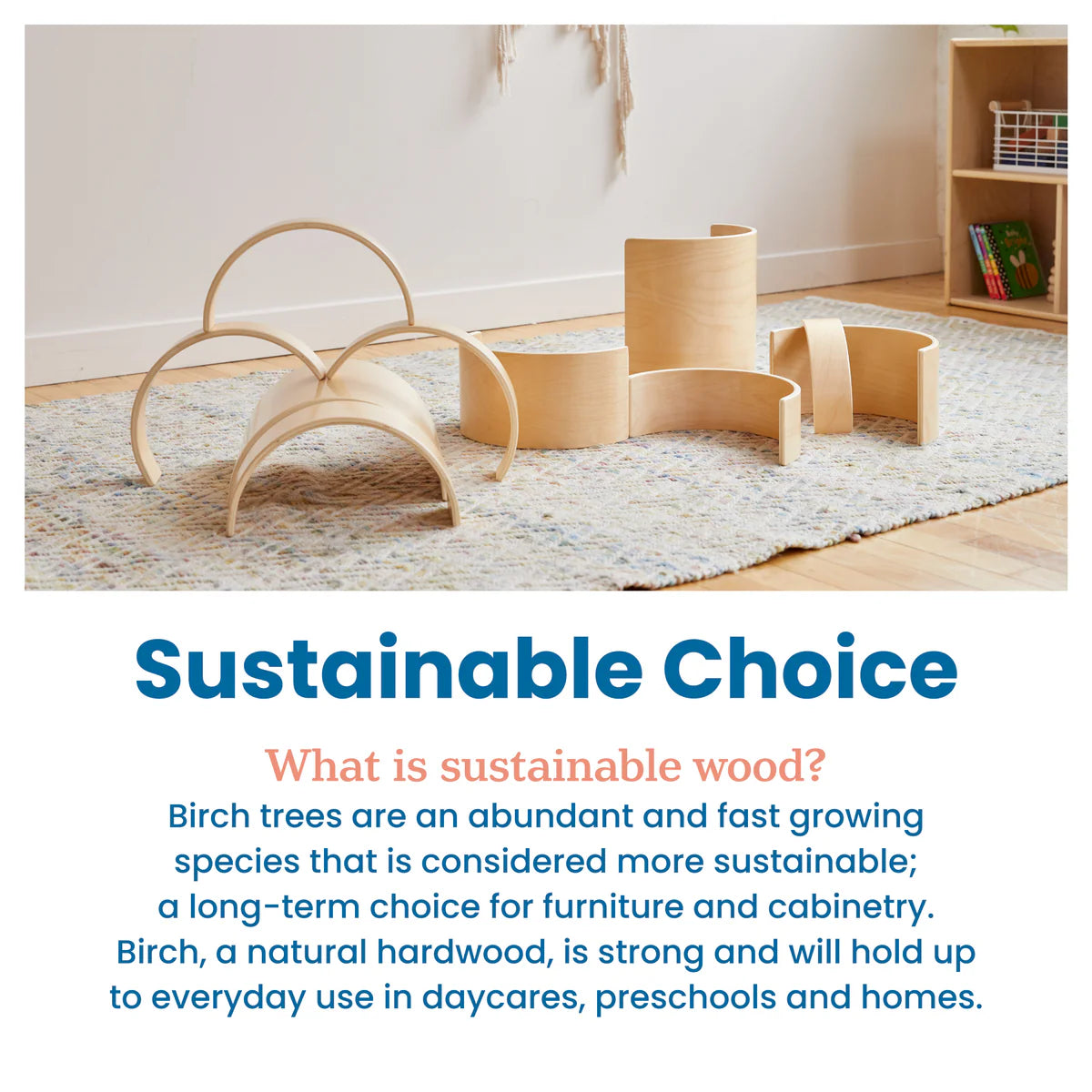 Inspire little builders to construct and create with ECR4Kids Wooden Tunnels and Arches. From simple tunnels to elaborate city spaces, students employ problem-solving and critical thinking skills as they stack and build with increasing complexity. Open-ended play supports imagination, creativity, and helps develop independence as children design ramps, racetracks, and towers in countless arrangements. Use individually or pair up for teamwork, collaboration, and cooperative learning. The use of building toys introduces early math concepts including height, measurement, and balance to your child during playtime. Children can also explore the ability to create shapes with the curved blocks like flowers or circles on the ground. Learning shapes and sizes of the arches can help your kids distinguish between objects and grasp spatial reasoning. Enhance block play by combining multiple sets or pair with ECR4Kids Hollow Wooden Blocks, sold separately. Constructed from sustainably harvested birch plywood with a durable finish sealing the wood surface and resisting scratching. A UV inhibitor helps blocks resist ultraviolet light and yellowing. Natural birch plywood is extremely durable and will hold up to everyday use in daycares and preschools, and early childhood environments.