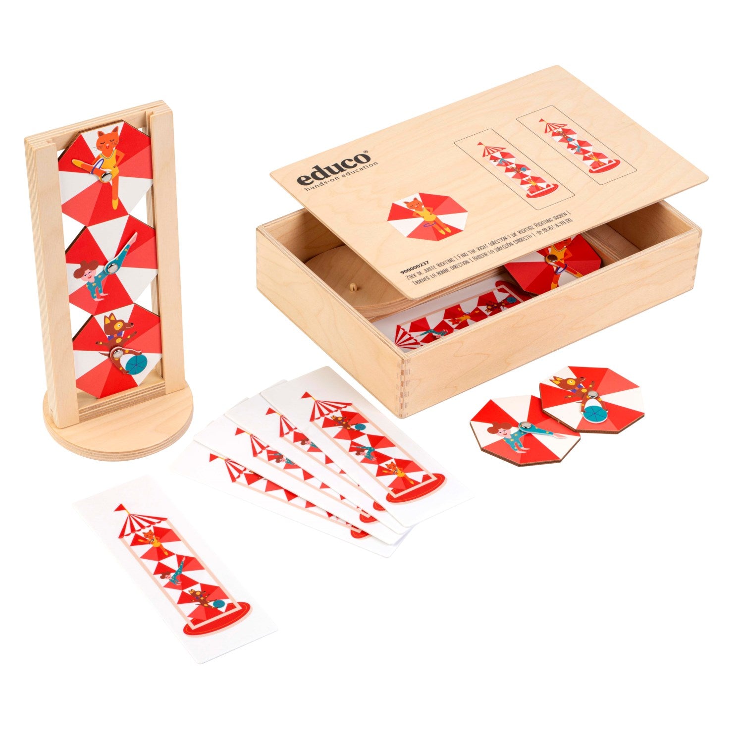 2 wooden stands 6 wooden acrobats 8 assignment cards (=16 exercises) wooden box (33.5 x 22.5 x 7 cm)
