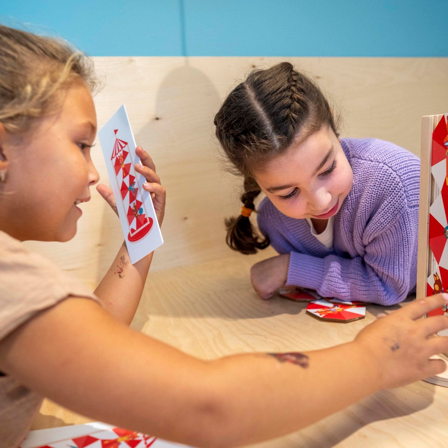 Place the acrobats in the stand in the correct order. Take a good look at the assignment card and put the legs in the right position. Start easy with positions like left, right, top and bottom. Make the assignment more difficult with positions like bottom left, top right, etc. Practise spatial orientation and naming spatial concepts.