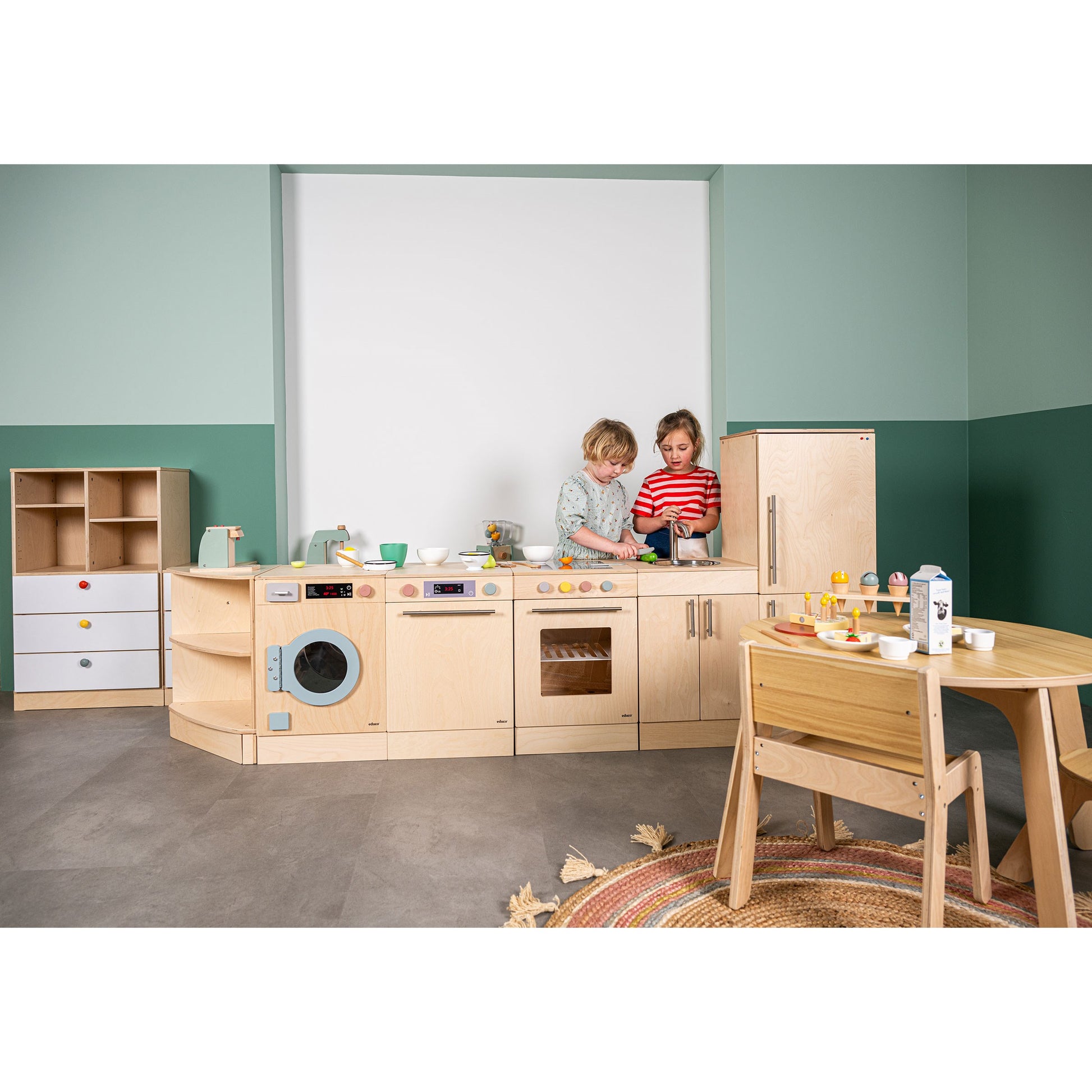 Looking for materials that challenge kids to engage in role-play? Create a recognisable environment with Educo's household elements. By using a realistic layout of the fridge-freezer and 'real' details such as metal handles, this fridge-freezer is very recognisable to children. All Educo elements can be fitted together as one unit.