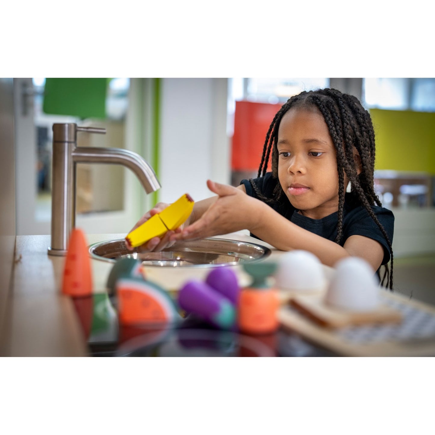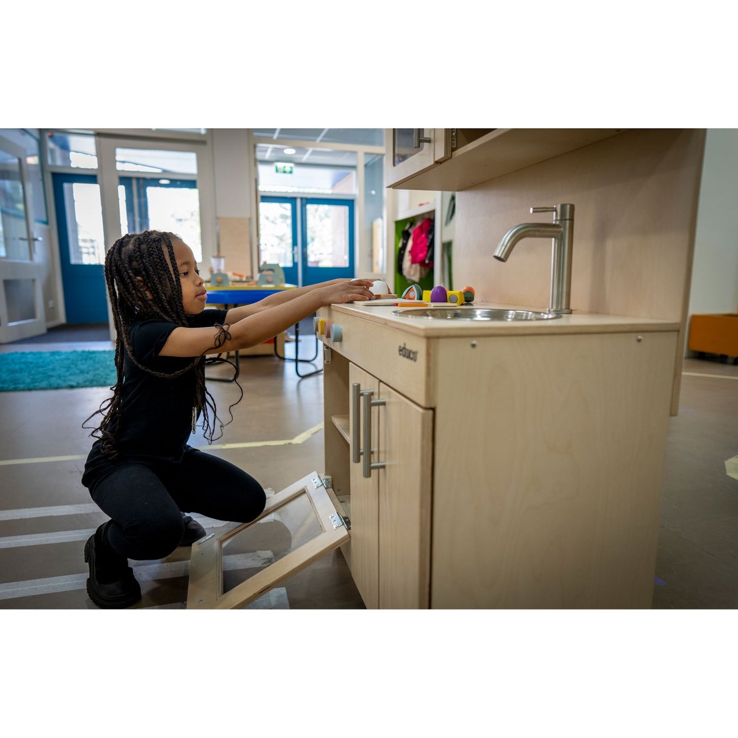 Looking for materials that challenge kids to engage in role-play? Create a recognisable environment with Educo's household elements. By using a realistic layout of the kitchenette and 'real' details such as the induction hob, buttons that tick when turned, the metal tap, sink and handles and the microwave, the kitchenette is very recognisable to children. All Educo elements can be fitted together as one unit.