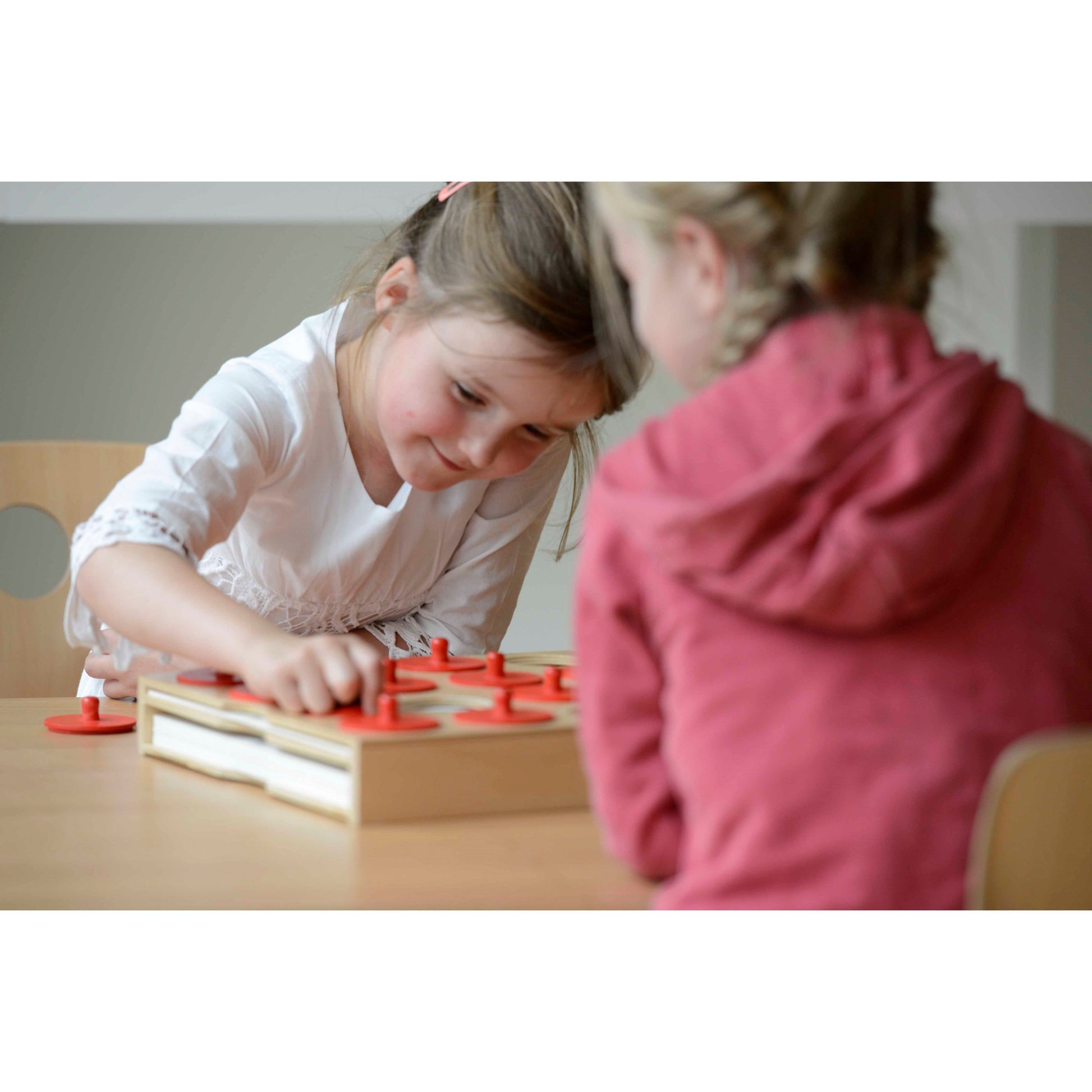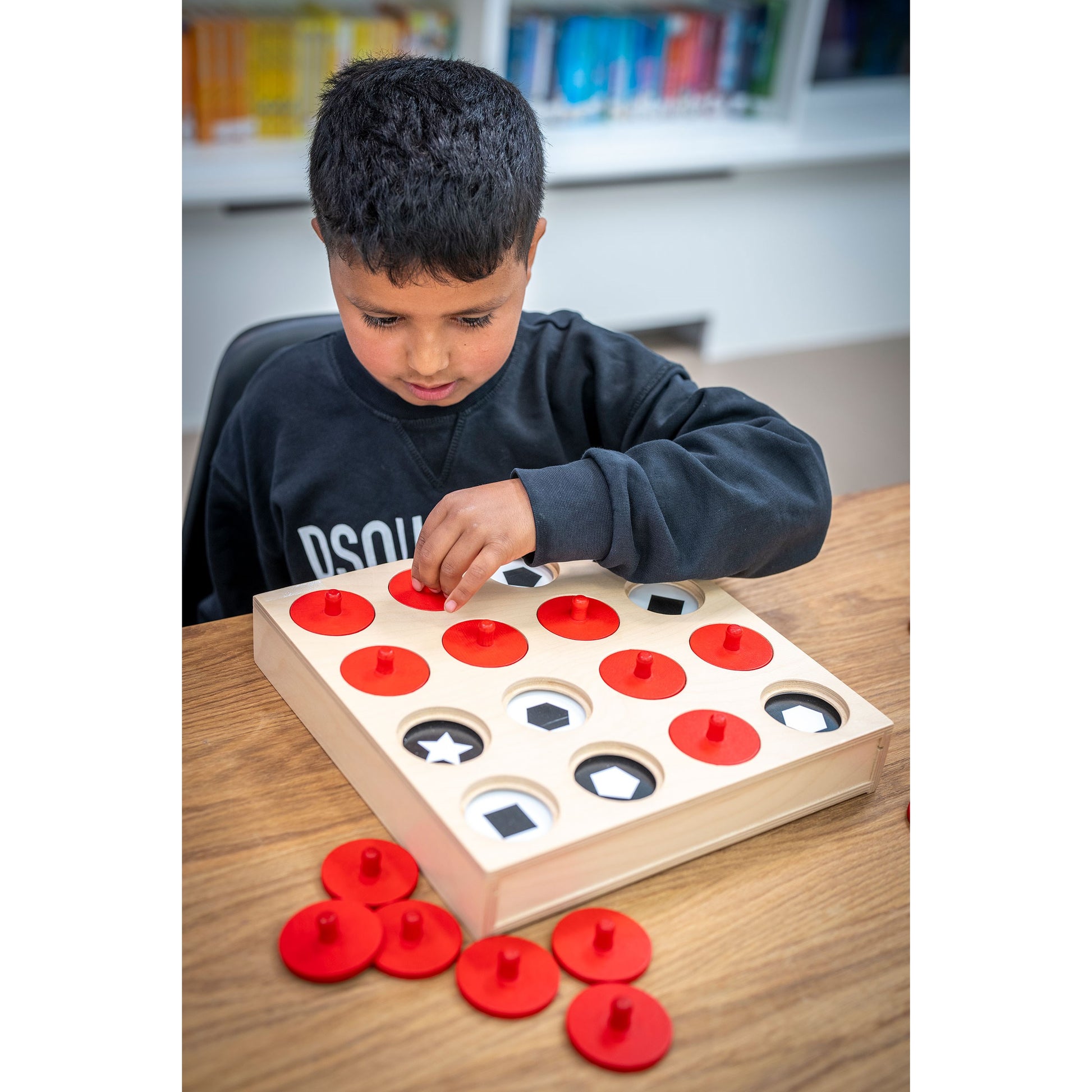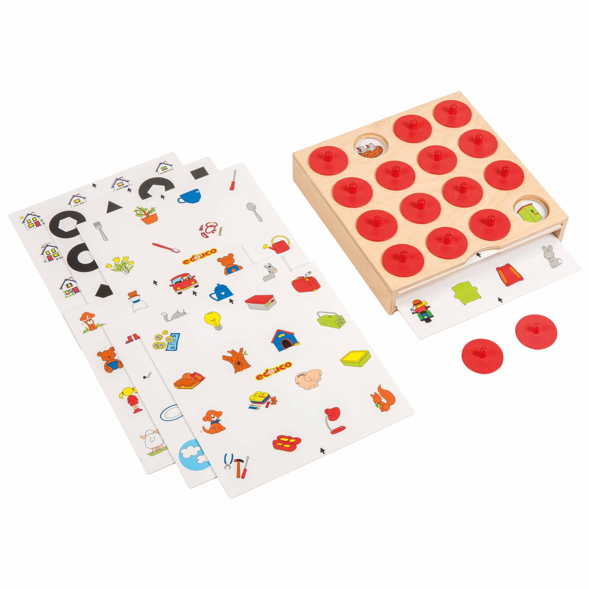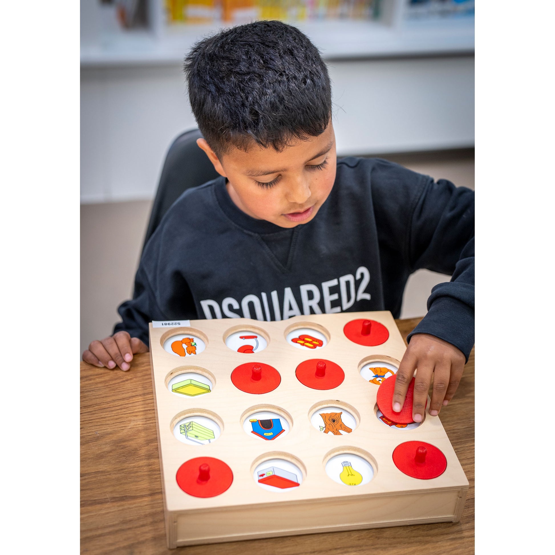 Insert one assignment card into the game box upper shelf and try to find the related pairs by lifting the red discs. Develop hand-eye coordination, spatial insight and visual discrimination.