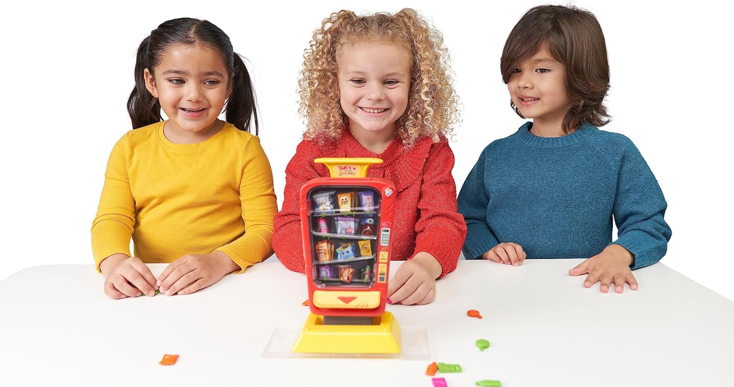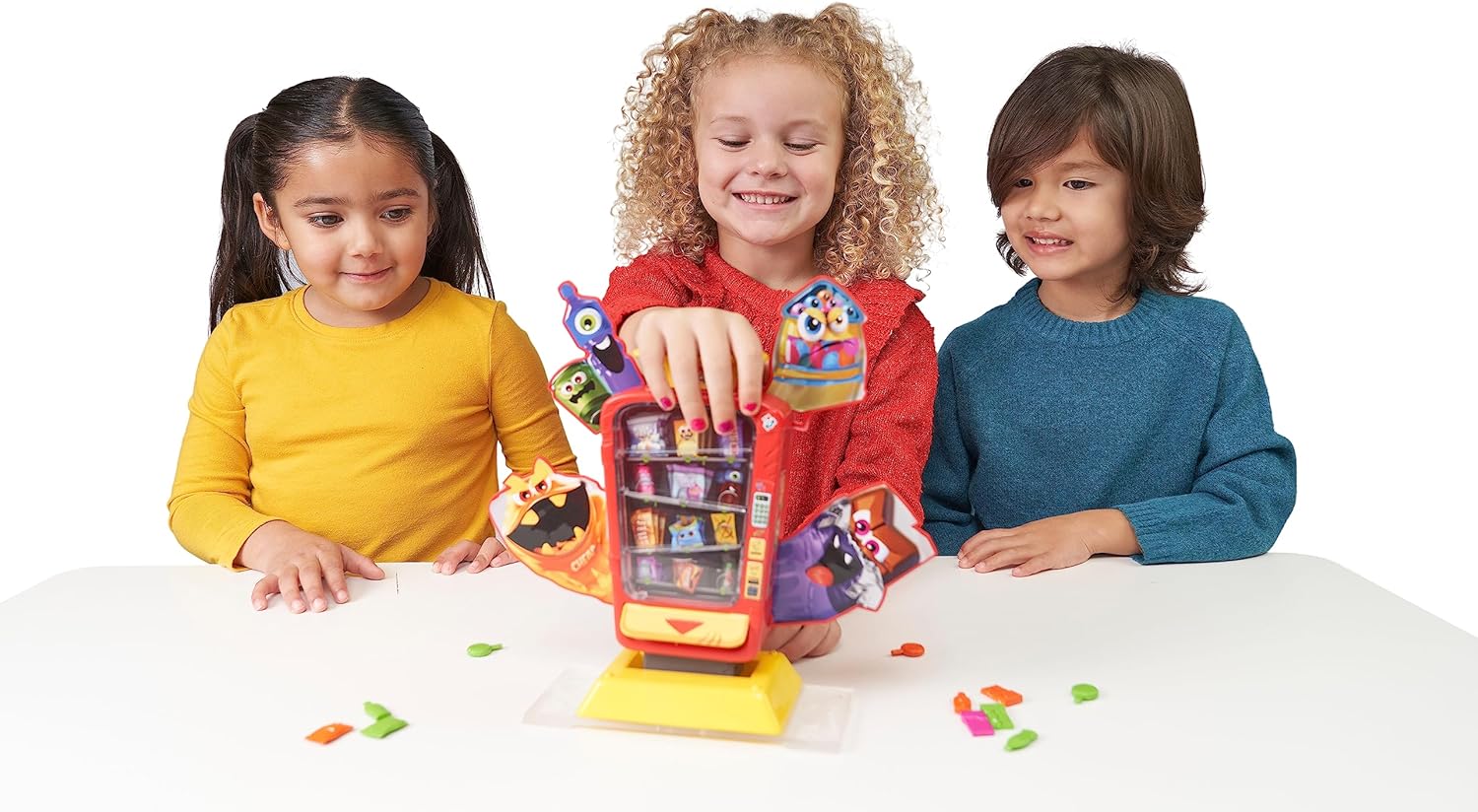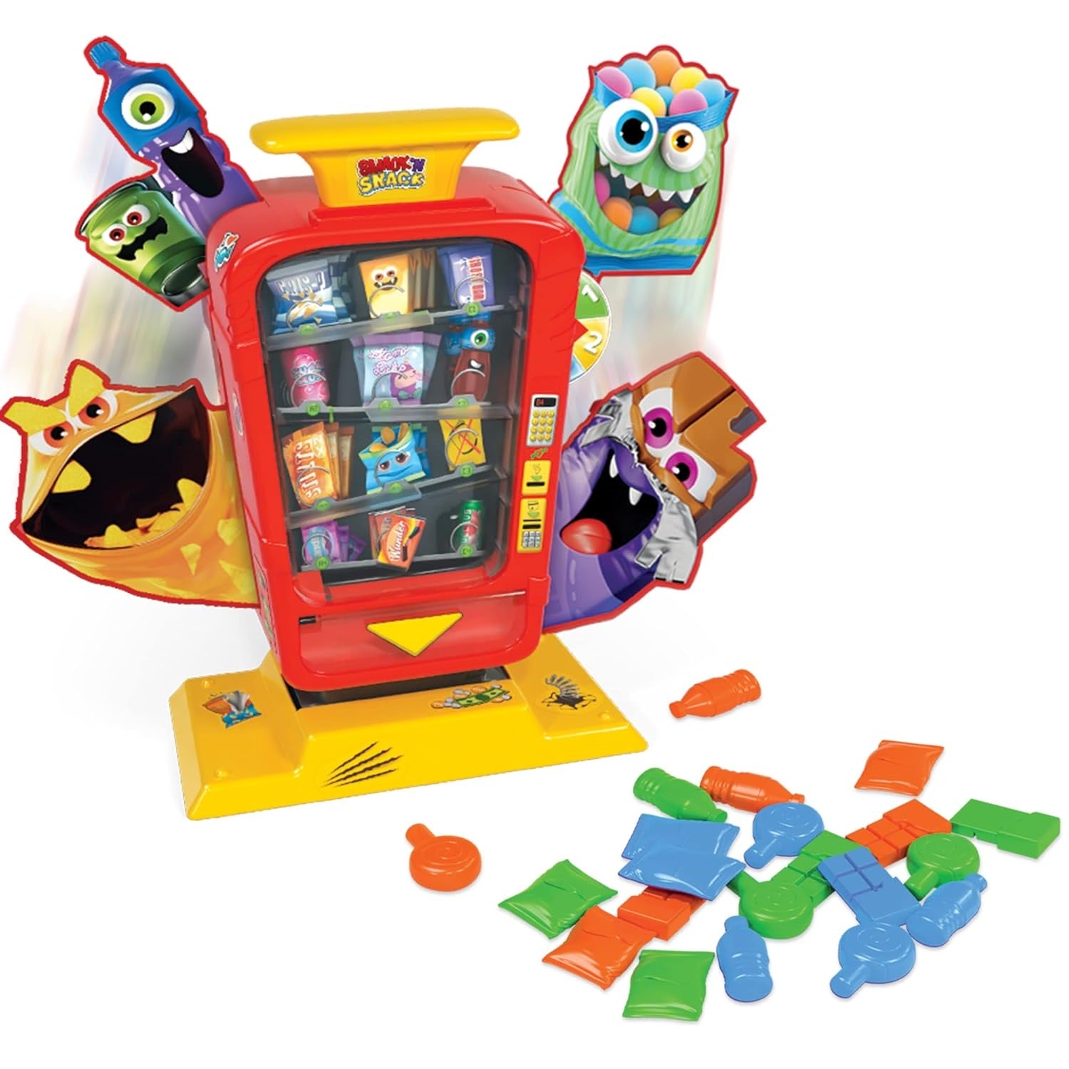 Get ready to smack this vending machine and take back your snacks before it attacks! Spin the wheel and drop some treats into the top of the game unit. Then give it a whack and press down on top to see if your treats pop back out! But be careful -- eventually the monsters will get tired of being smacked around and jump out! Whoever has the most points when the monsters attack wins.