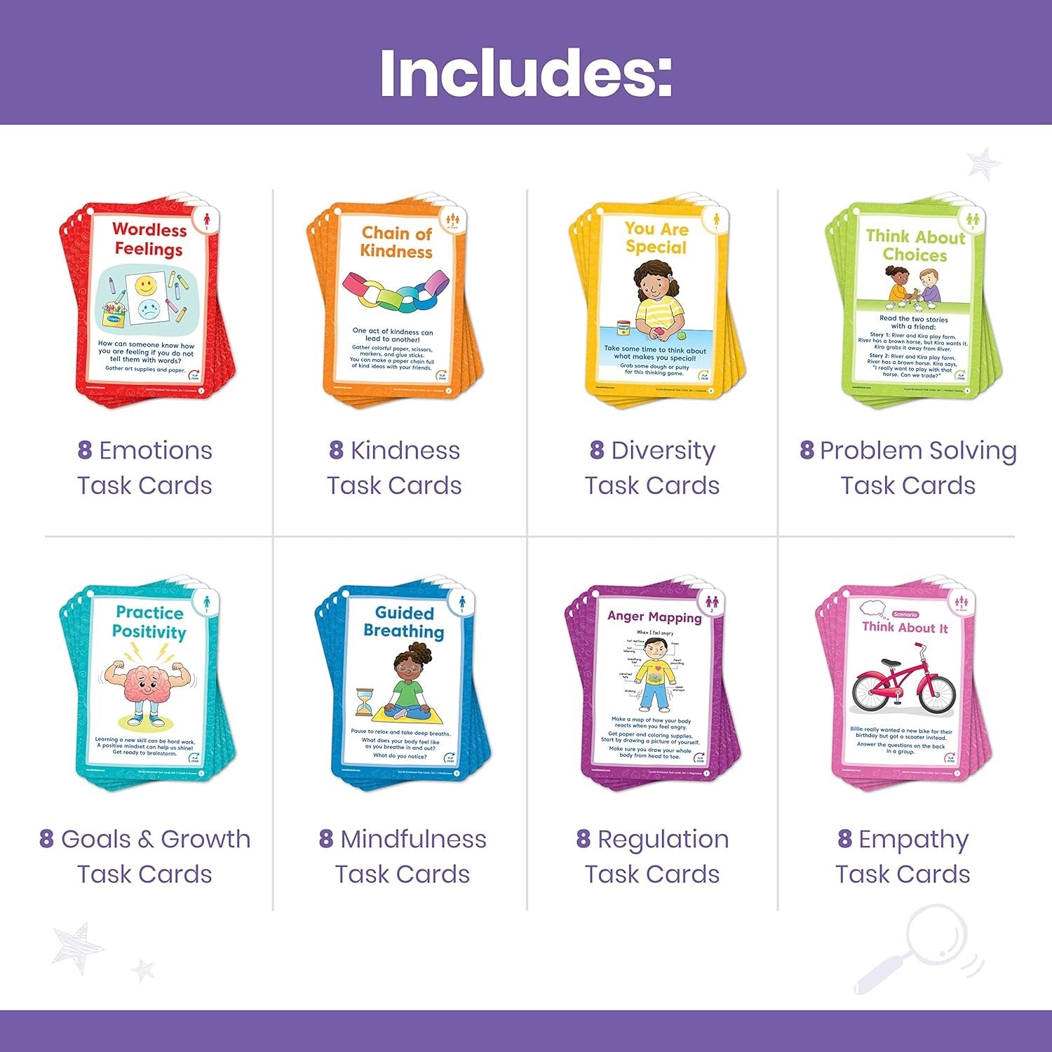 這些獨特的任務卡確實是一個很好的工具,可以鼓勵孩子們探索社交情感發展的概念, 例如情緒調節、問題解決、合作以及對自己和他人表達善意。