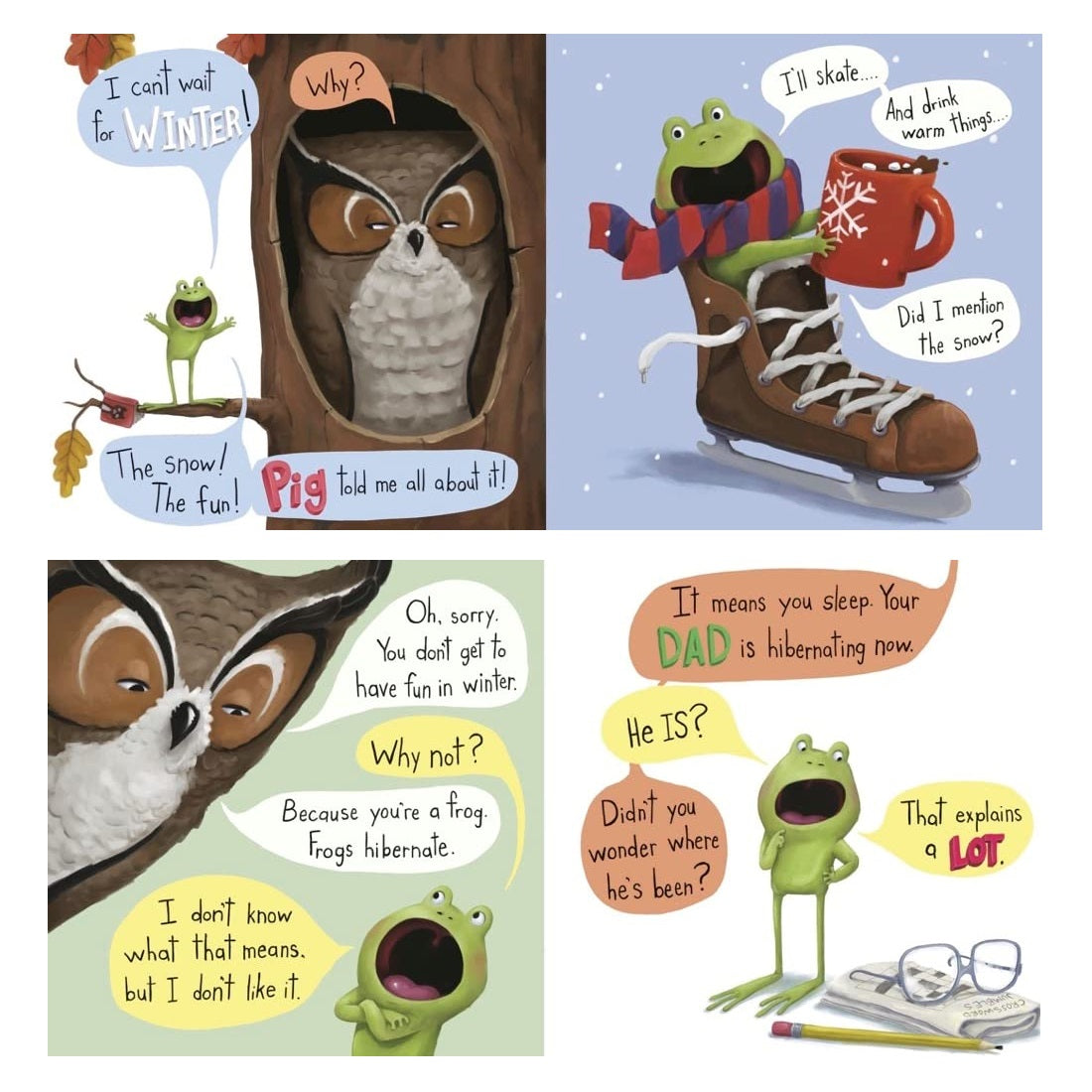 Frog is excited about autumn and the coming of winter. But when Owl informs him that frogs hibernate till spring, Frog is upset at missing out on all the snowy fun. In this hysterically funny twist on the classic "I don't want to go to bed" dilemma, Frog comes up with all kinds of reasons why he's not going to sleep through winter, until he devises a clever way to convince his friends to come along for the ride.