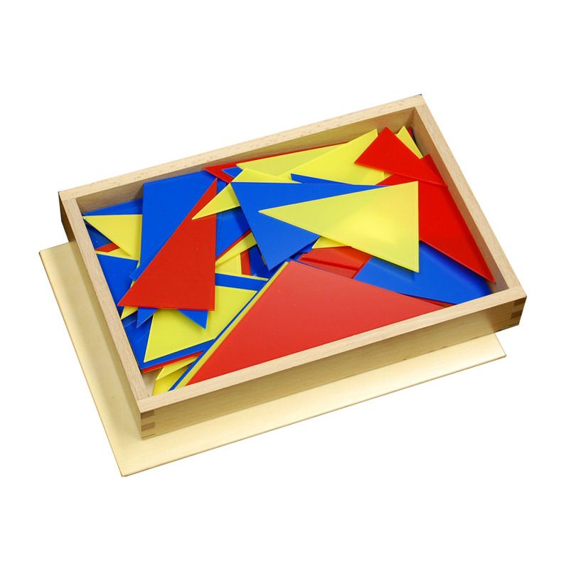 A wooden box with lid containing 7 different types of triangles, each in 3 colors and each in 3 sizes.
