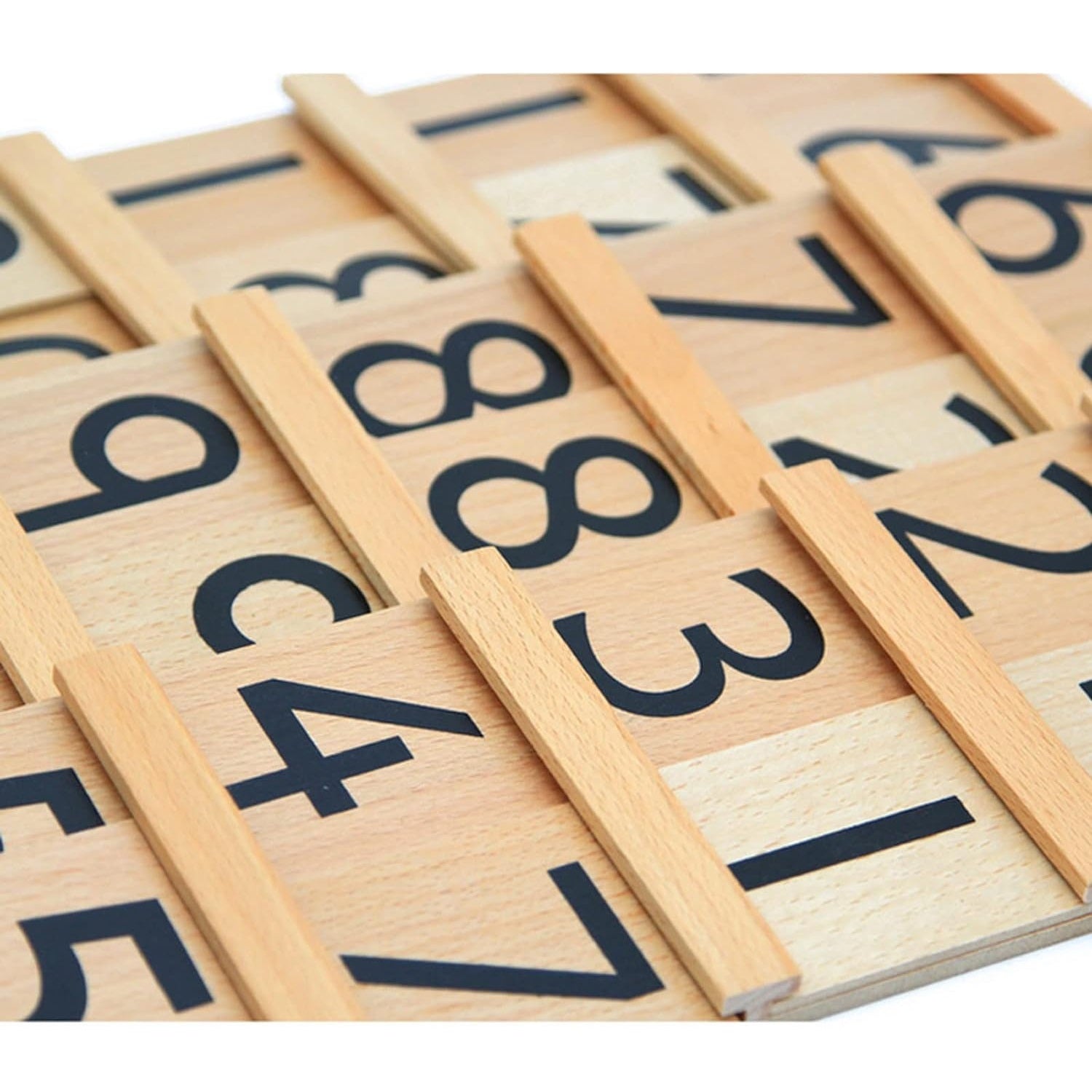 幾十板:兩塊塞根板,各有五個分格。 其中的一板印有10、20、30、40、50,另一塊板則印有60、70、80、90,最下面為空格。 九張印有1—9的木製卡片,這一些可以插入塞根板中印有數字0的位置。