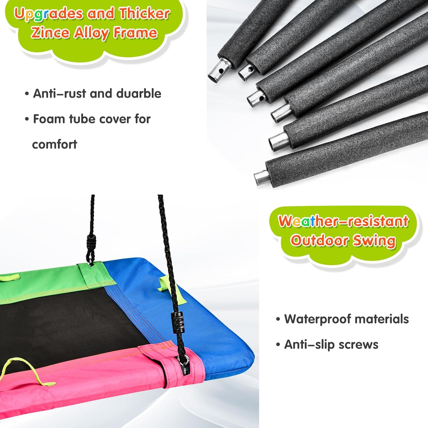 - The galvanized alloy frame is wrapped in soft foam tubes to prevent collisions and ensure comfort during extended outdoor fun.