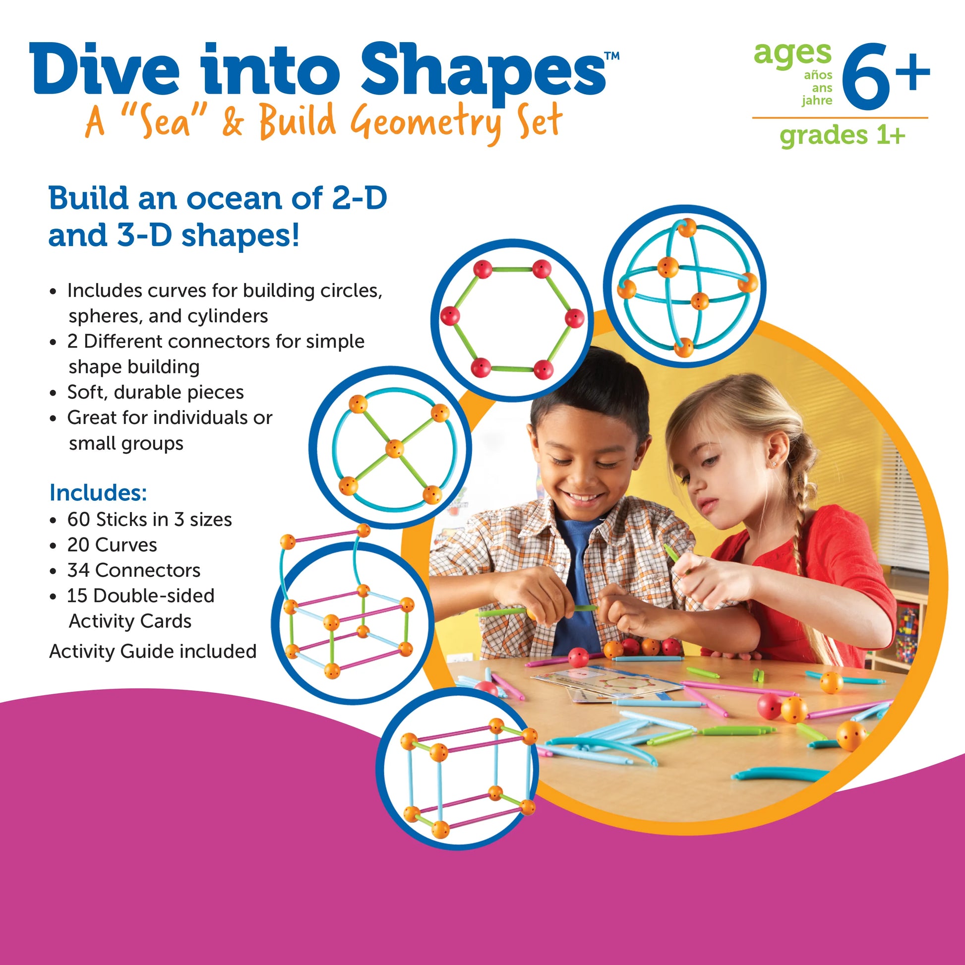 Splash into geometry! Combine sticks in 3 sizes, along with curves for making circles and cylinders, with 2 different types of connectors to build 2-D shapes. Then, combine them to make new 2-D shapes or even 3-D shapes! Child-friendly set features durable sticks, curves, and connectors.