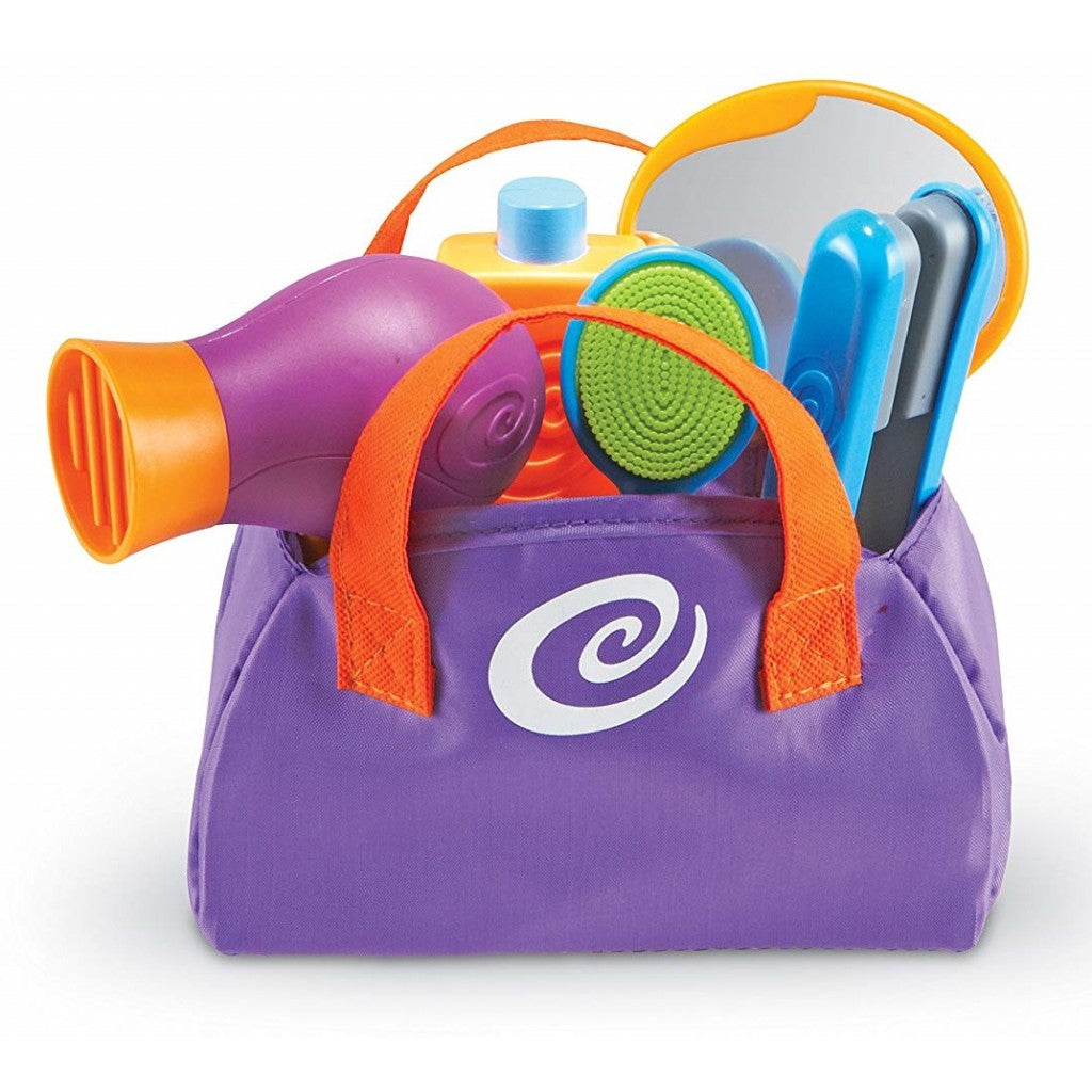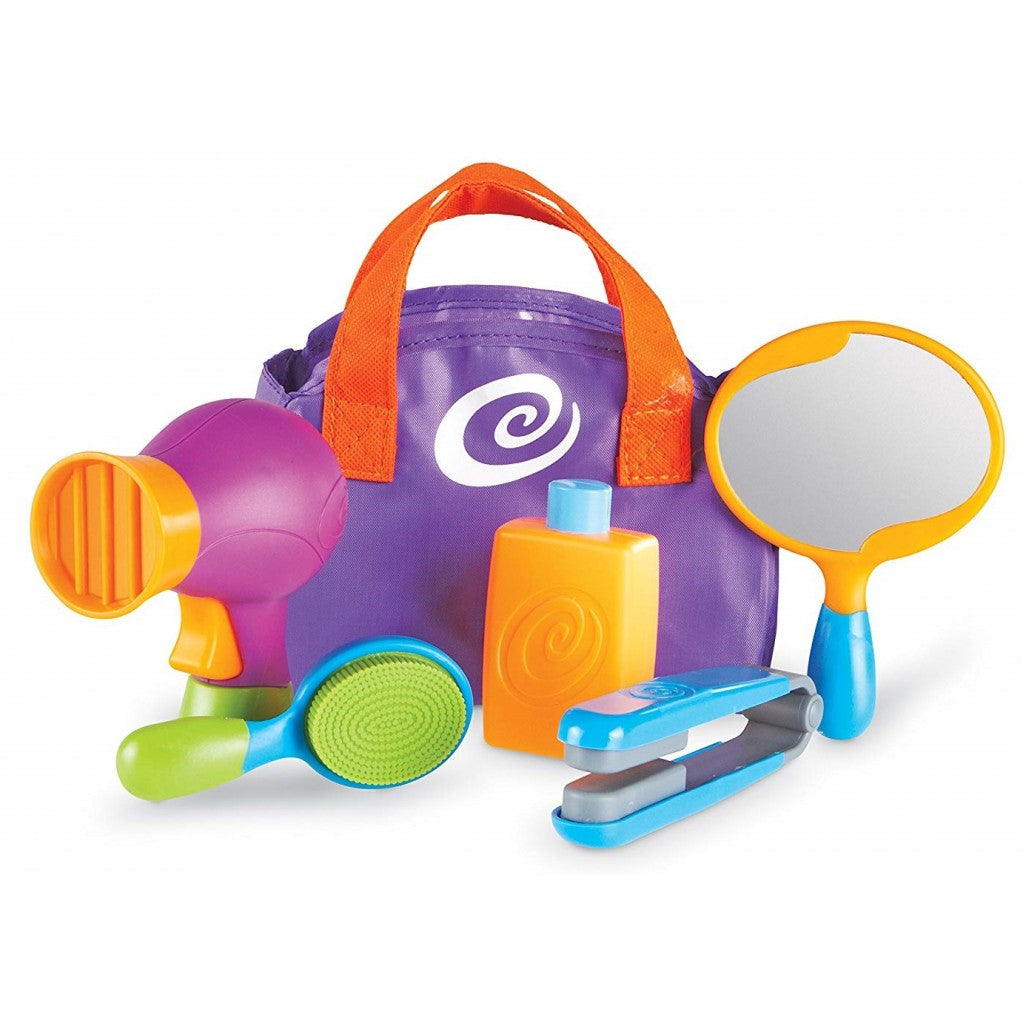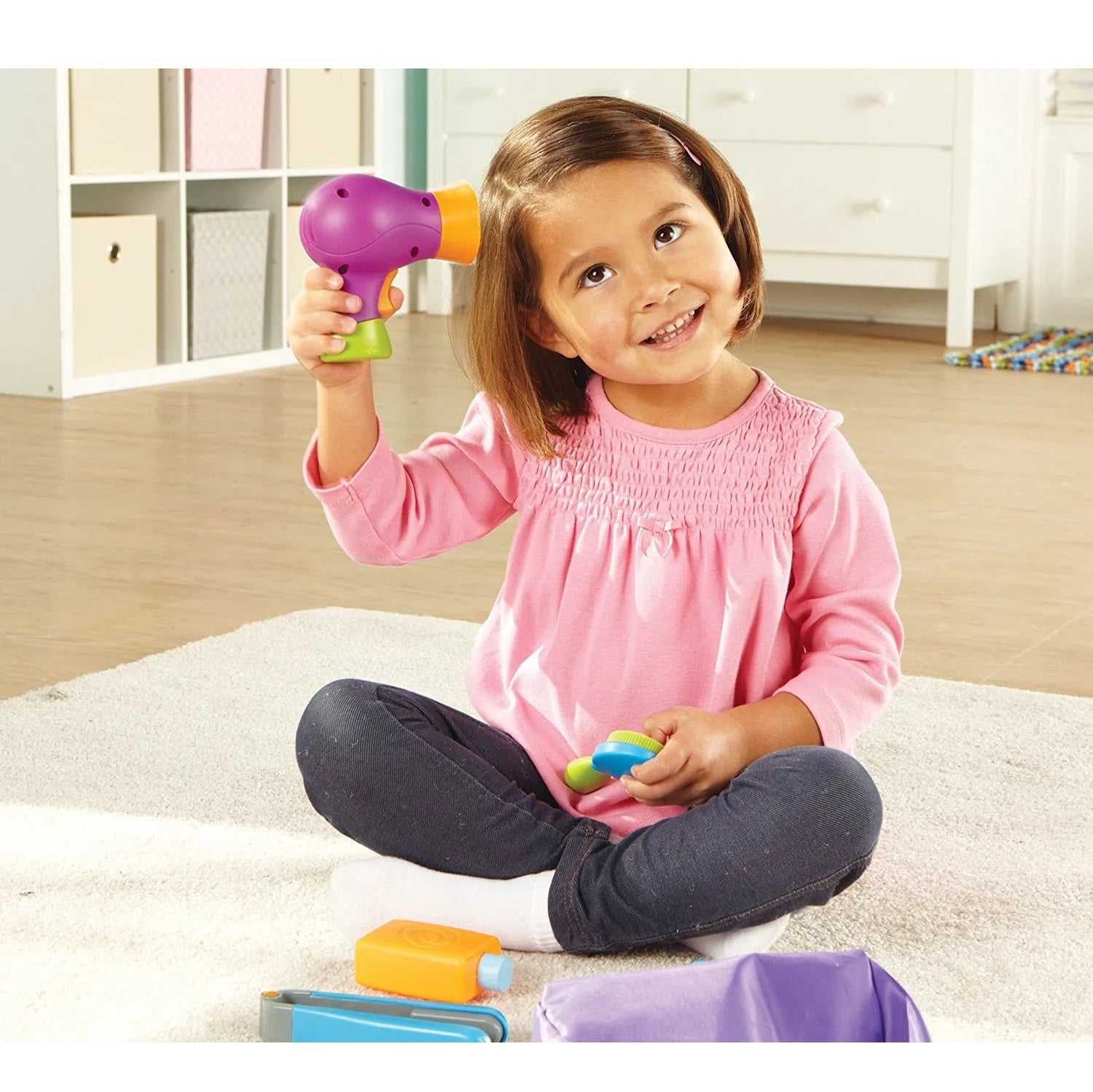Learning Resources New Sprouts™ Style it!: Get your style on! Look your best with this perfect styling set. Style enthusiasts can express themselves with this colorful collection that includes a hair dryer that makes familiar whirring sounds and a mirror. Tools are sized perfectly for little hands, and a handy caddy keeps all essentials (including a brush, flat iron, and shampoo bottle) organized and ready for your next new hairdo.