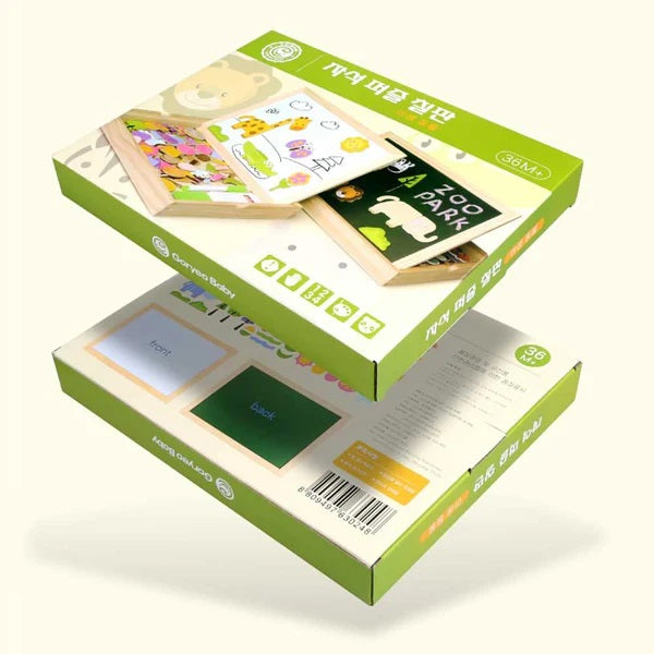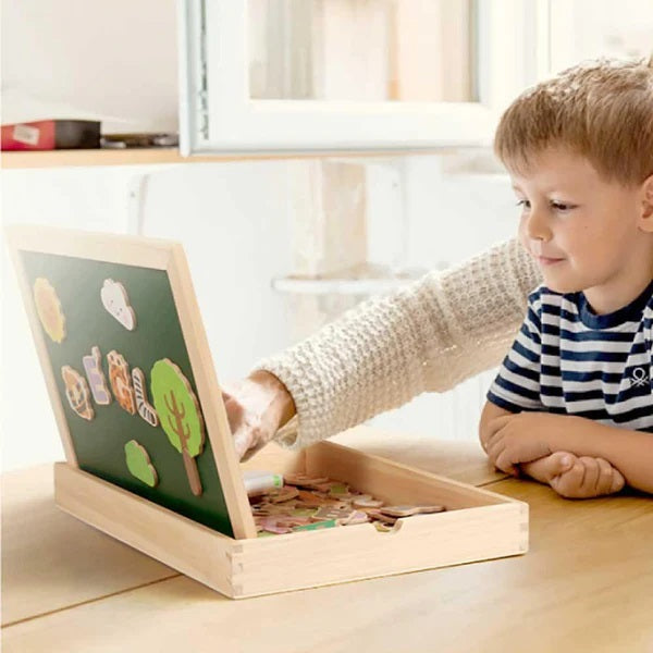 Children can assemble magnetic puzzles composed of animals, plants, and geometric shapes at will to understand the content. The lid of the box is composed of two sides: a matte green drawing board and a glossy white drawing board. Both sides can absorb magnetic puzzle particles. The green drawing board can be painted with chalk, and the white drawing board can be drawn with water pens, whichever you like.