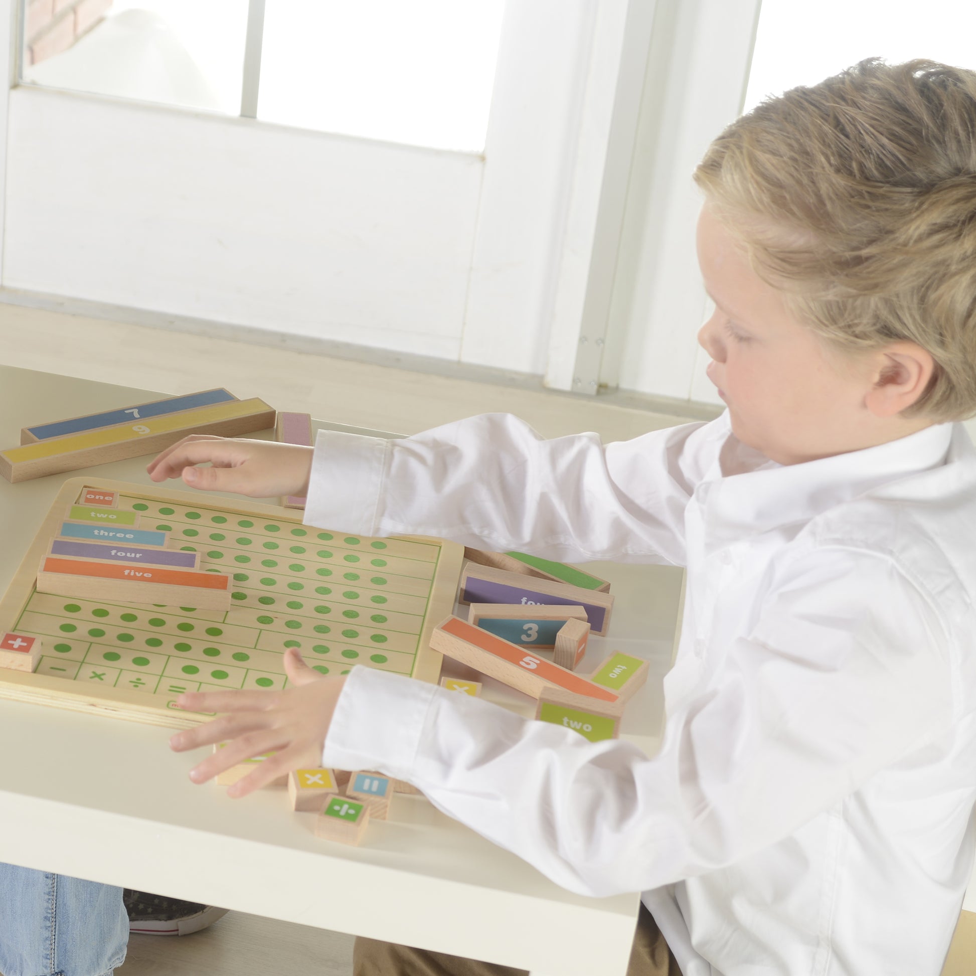 這個厚實的木塊組包含所有數字鍵到 10。每個單獨的棋子都完全按比例縮放,並且作為單個正方形的倍數存在——因此 2 塊棋子長度是其兩倍,3 塊棋子長度是其三倍,依此類推。該組還包含 2 組數字運算符號(+、-、x、÷ 和 =)以及幾個額外的單個和雙個組件塊。可以使用這些棋子進行大量的簡單數學計算,例如加法、減法和計數。使用單個正方形作為計算檢查器增加了動覺學習過程。數字出現在棋子的正面,而在背面它們顯示了適當數量的點,可以大聲數出來以驗證總和是否正確。
