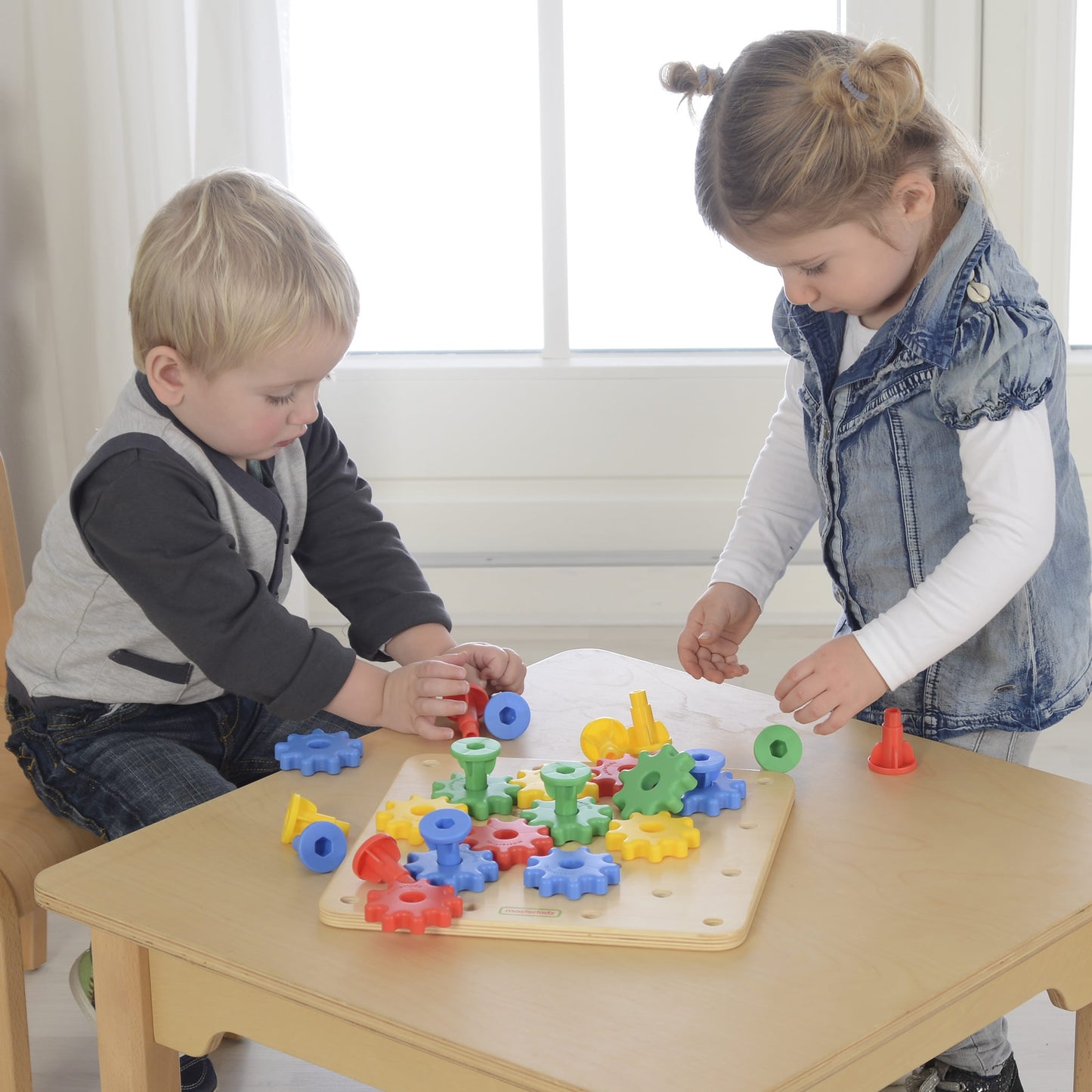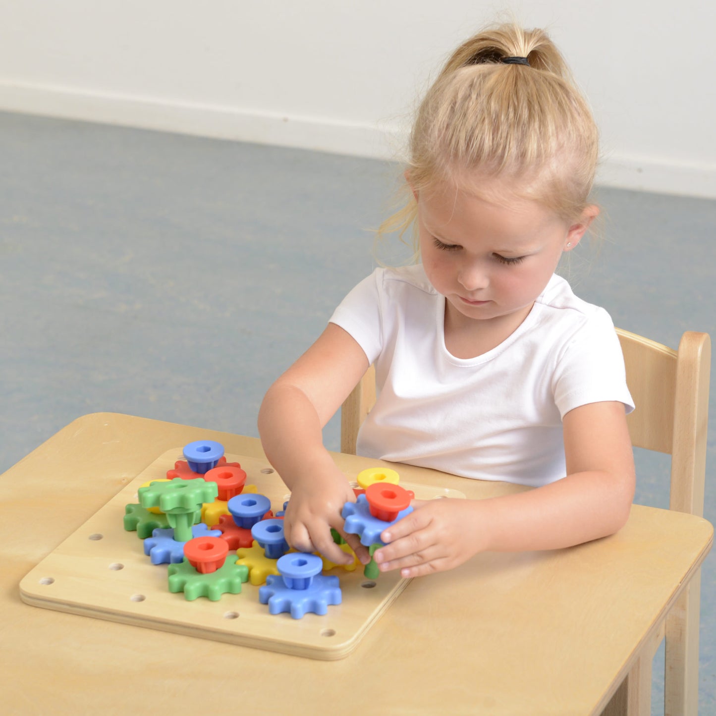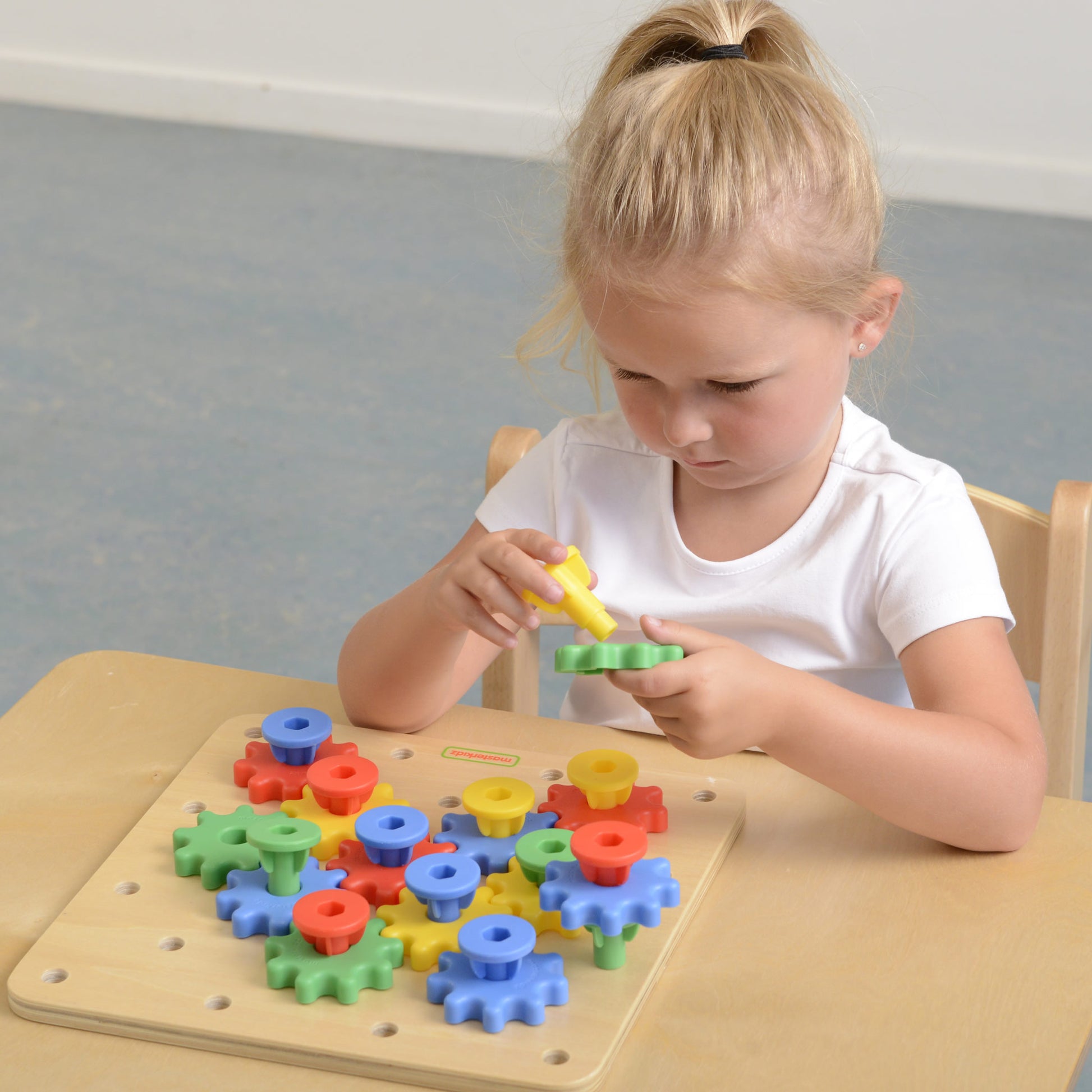 幼兒體驗 STEM - 齒輪遊戲台是必備的。 使用時幼兒將不同顏色的齒輪釘在釘板上,使齒輪嚙合在一起。 當一個齒輪轉動時,連接齒輪也會轉動。 釘子還可以將齒輪堆疊為第二層,增添樂趣。 使用此學習板時,良好的手眼協調能力和周到的齒輪放置至關重要。