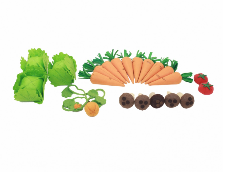 含成熟高麗菜、番茄、胡蘿蔔、南瓜與蘑菇等22件,鮮豔色彩與柔軟觸感,安全適合小手抓握