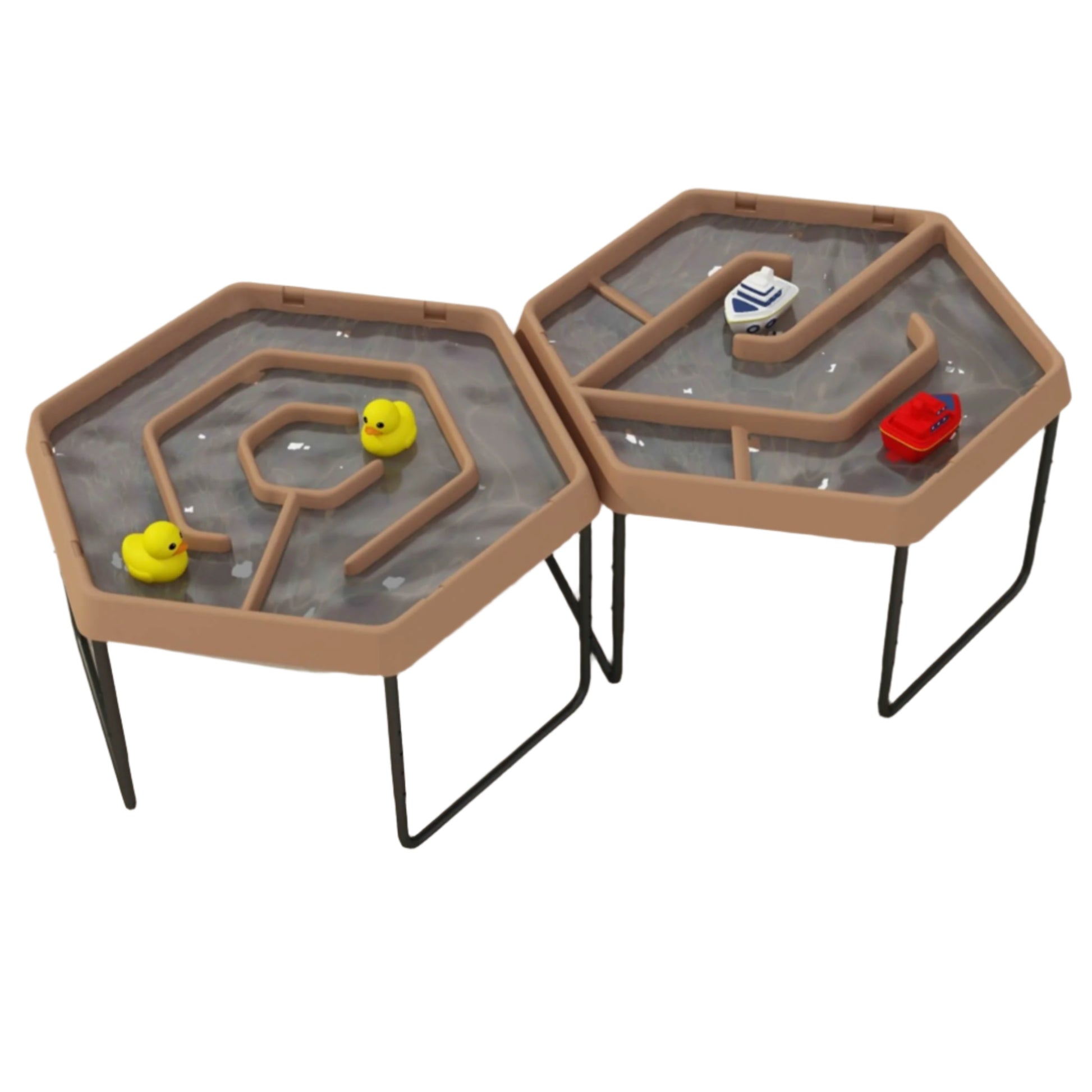 The Hexagonal Labyrinth Play Tray is designed to inspire imaginative play with both open and closed compartments. The channels can be utilized for various activities, such as sailing boats, transporting goods, or acting as a defense for a central castle fortification.