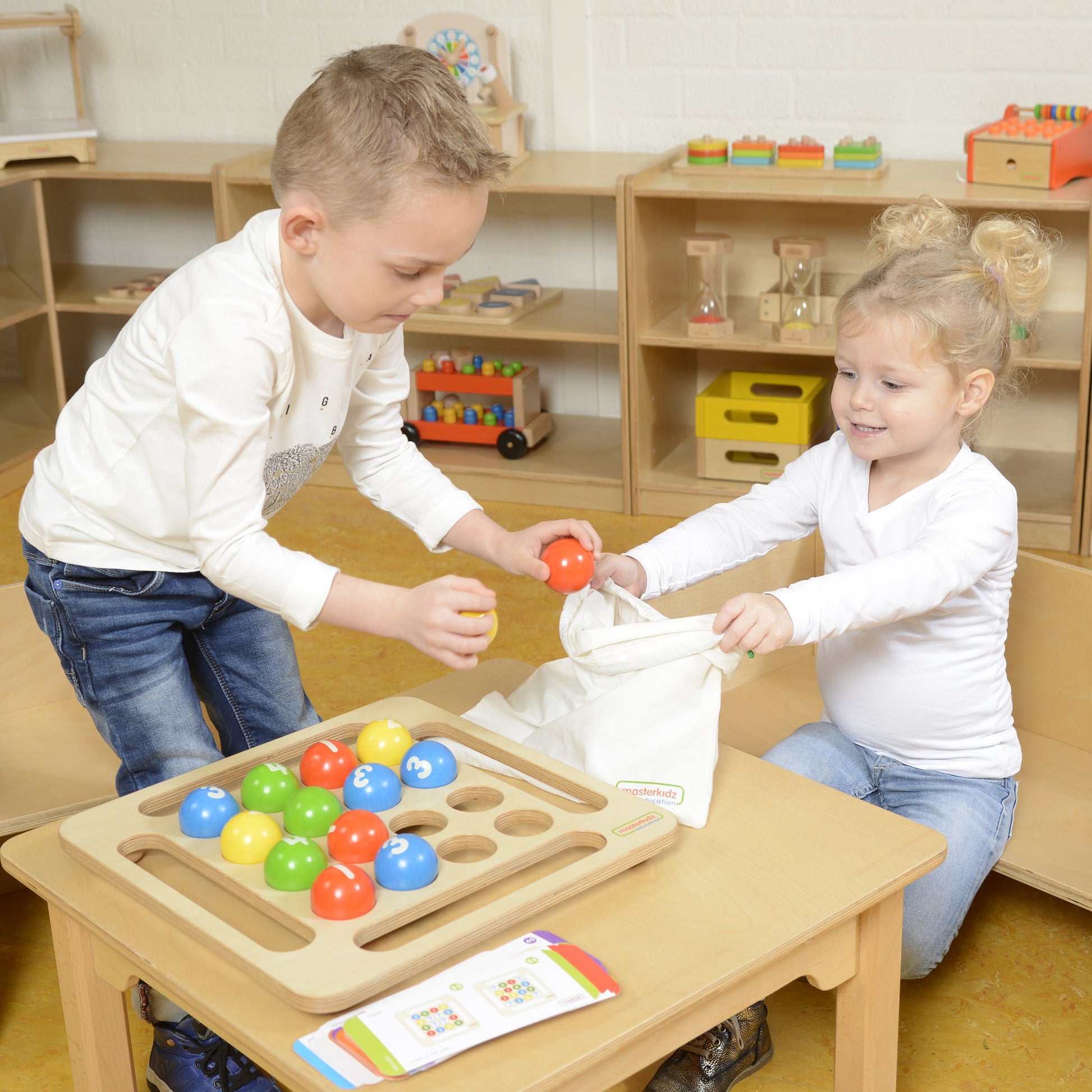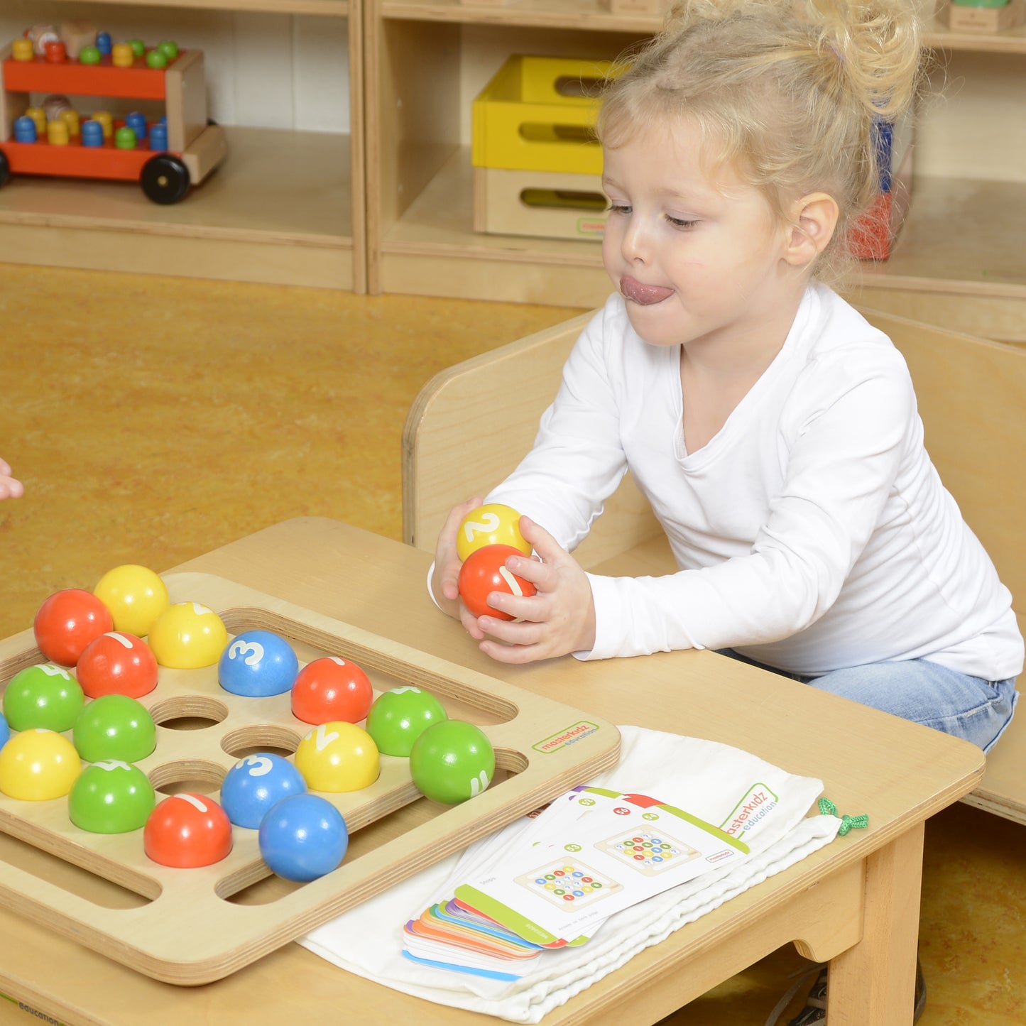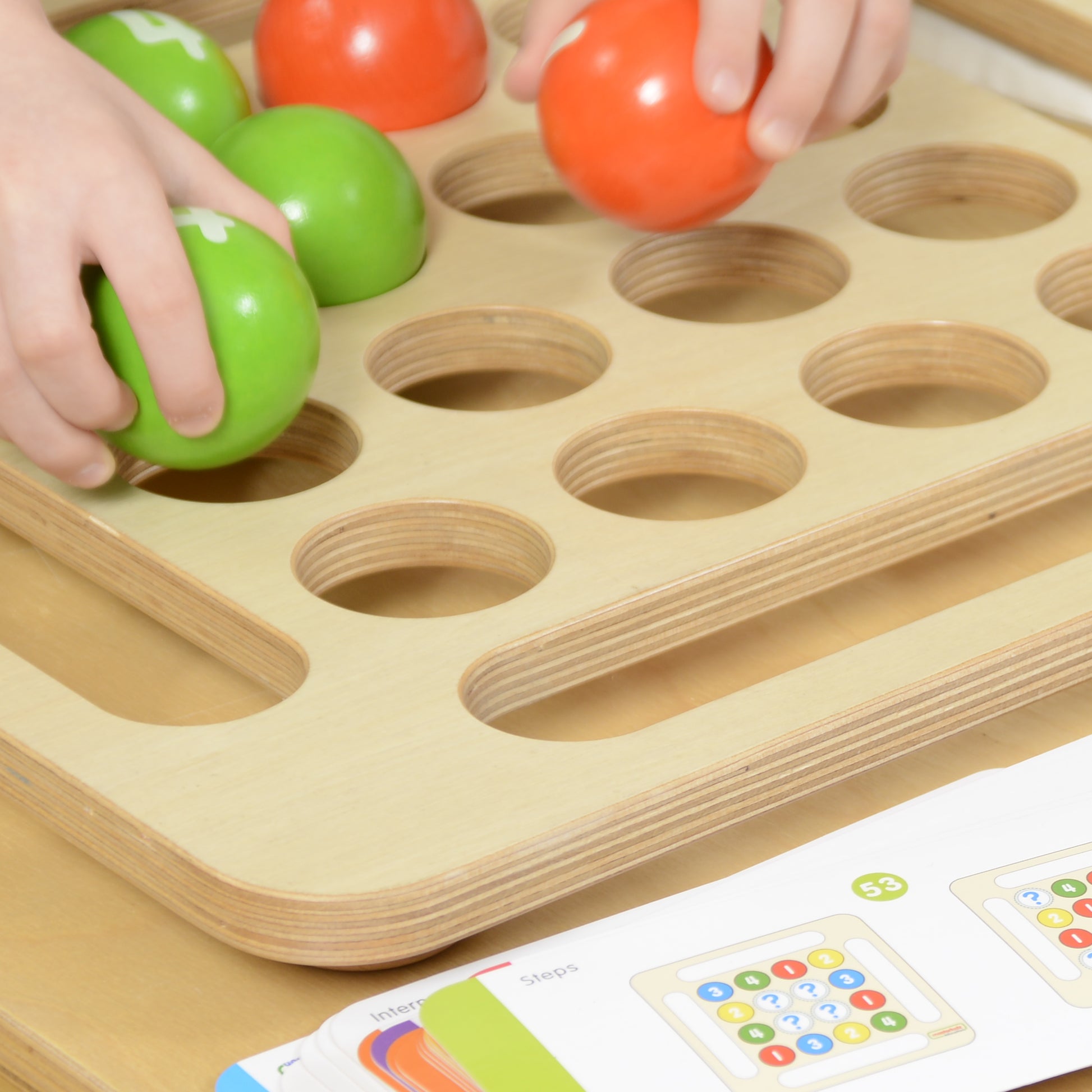 This beautiful set with its plywood base and colourful wooden balls provides a great starting point for all sorts of counting, number, sequencing and logic work. Children will enjoy the size and feel of the hardwood balls and quickly identify their properties. They can arrange them in patterns, in free play or in lines by colour. And because the balls are numbered - sequences can be made by number too. Children will also benefit from the work cards that accompany the set to create prescribed patterns with progressive challenges towards three-dimensional stacking. The set can be used by a single child, but when 2 children work together there is the added benefit of collaboration and conversation that will promote language development. The set comes with a play guide and a draw-string bag to place the balls into after use.