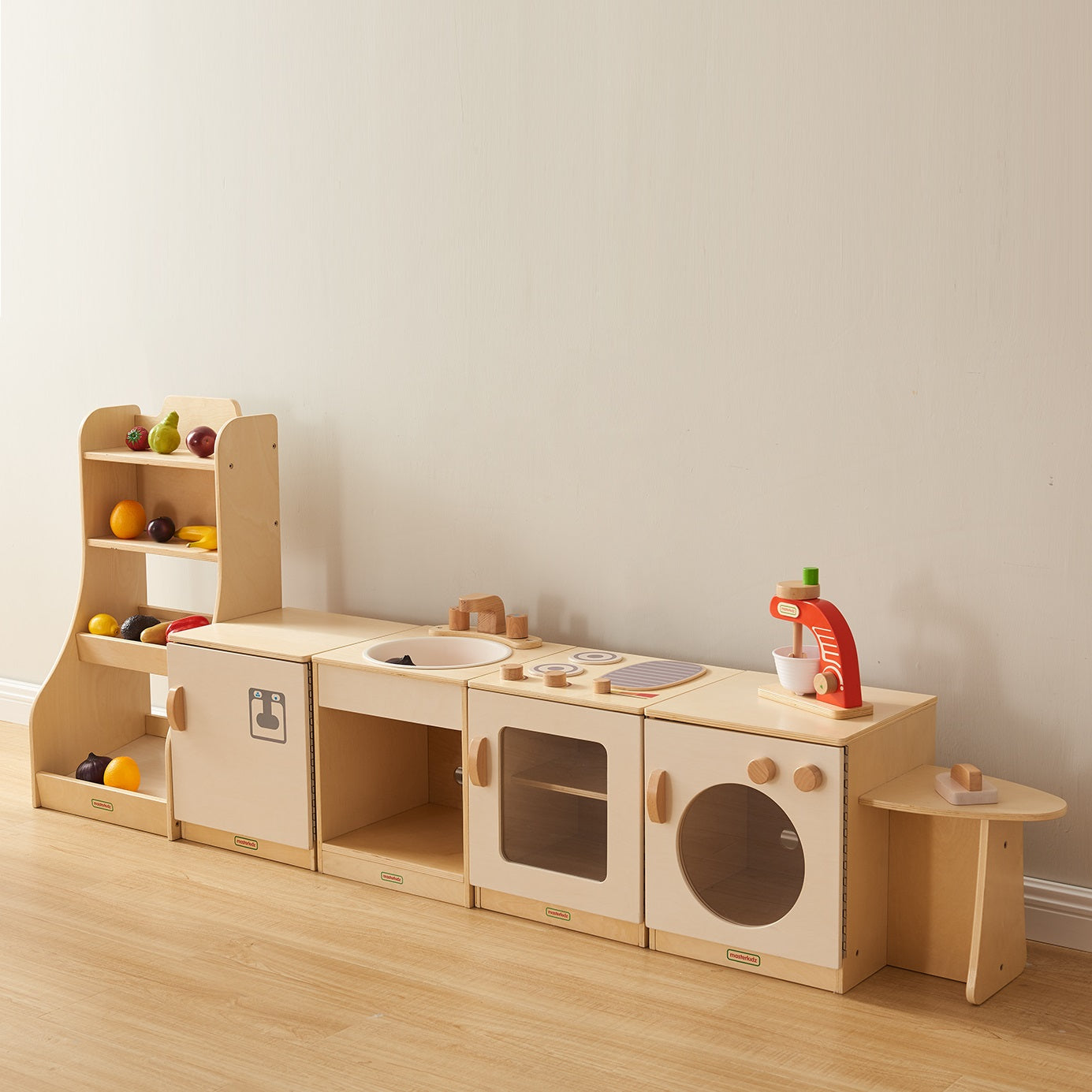 The Kiddie Cloud Series Toddler Kitchen Role Play Set, comprises of 6 components providing a ready to go home corner with some excellent additional options for extended role play. Units are finished in a natural wood colouring so that there is no distraction away from the functionality of each piece. To add to the reality all of the doors open, dials turn and each provides storage for the items they would hold in any real kitchen too. A tough varnish finish provides exceptional resistance to liquid spills, bumps, scratches, UV light and staining. A quick wipe clean with a damp cloth will restore the units back to new in a few seconds. In addition to the usual kitchen components, (Refrigerator, Stove/Oven, Washing Basin, and Washing Machine) the set also includes a Market Stand/Food Cupboard and fitted to the washing machine an Ironing Board and Iron. All items are made from solid hardwood, so will stand the test of time. The surfaces of the kitchen units are age-matched to pre-schoolers at 405mm. A range of play food, utensils, tools and dressing up clothes are all available to be purchase separately.