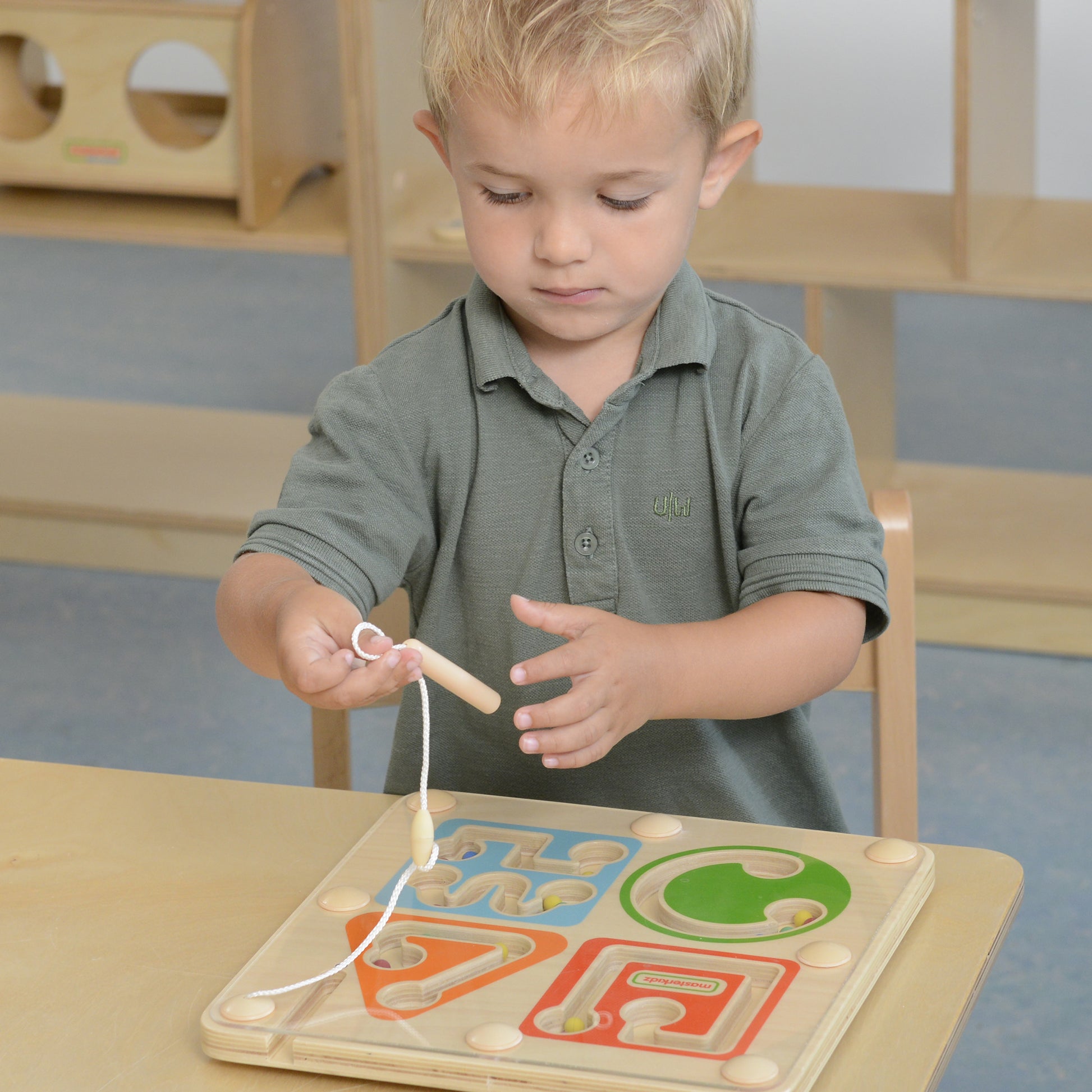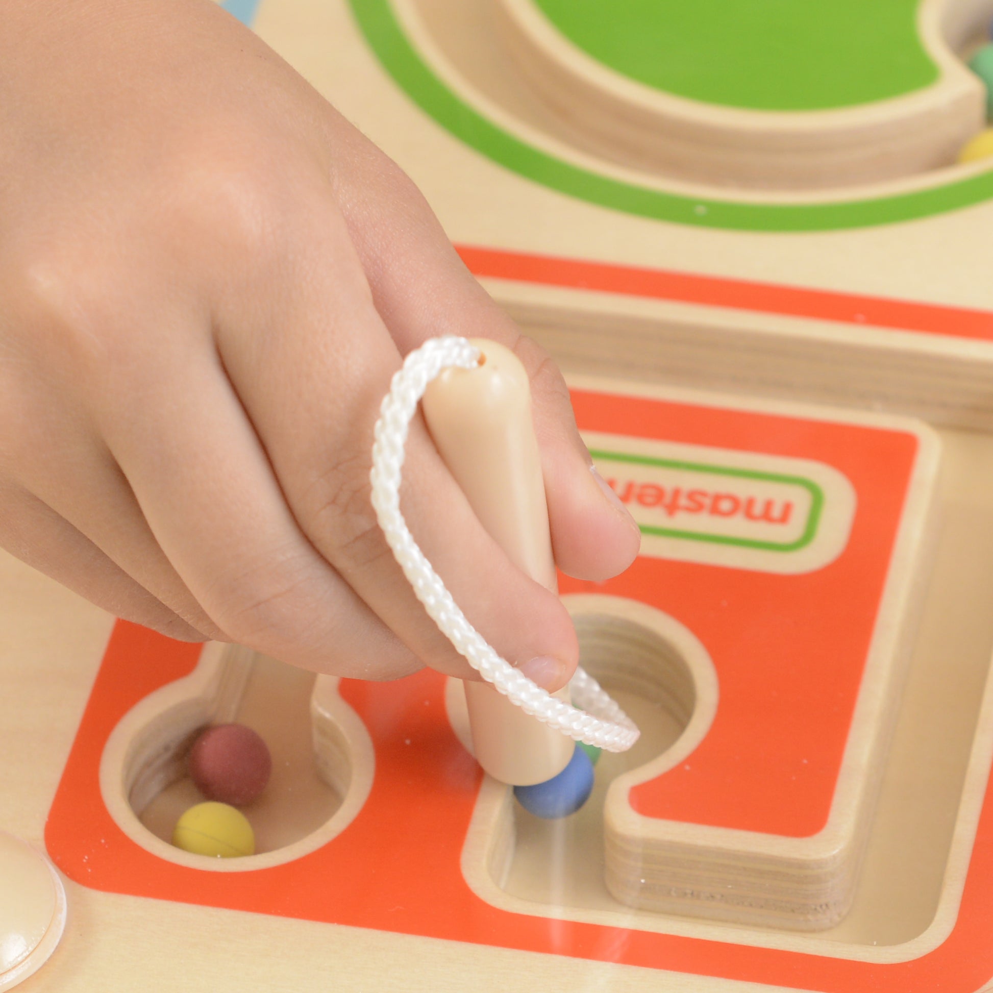 這個木 磁性滑珠迷宮 包含 4 個獨立的封閉式磁性迷宮,每個迷宮都包含可以使用磁性筆移動的球。形狀內的軌道提供了一系列漸進的手眼挑戰,專門設計用於提高關鍵的寫作技能。